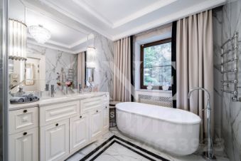 Лот: 9915028. Дом с мебелью 1250 кв.м на участке 70 cот. Кол-во спален: 7. Кол-во с/у: 10. Поселок ''Павлово''. Новорижское шоссе, 15 км от МКАД. Без комиссии для покупателя.Уникальная усадьба в классическом стиле с идеальным расположением у леса в поселке ''Павлово'' в 15 км от МКАД по Новорижскому шоссе. Дом построен по индивидуальному проекту, планировочное решение разработано совместно с архитектором Валерием Сеглиным c полным отказом от коридорных систем. Все комнаты первого этажа связаны с гостиной. Ей отведено самое просторное помещение, имеющее форму вытянутого восьмиугольника. Гостиная логически разделена на блоки: обеденный, каминный и зону отдыха. Справа и слева к гостиной примыкают оборудованный рабочий кабинет и зимний сад (соединяет парадную зону и SPA). SPA-зона оснащена бассейном и русской баней с настоящим срубом из дальневосточного кедра. Панорамное остекление открывает вид на террасу и участок, за счёт чего гостиная всегда наполнена светом. Стены покрыты декоративной штукатуркой светло-бежевого оттенка, в тон подобраны мебель и камин из травертина. Фрески выполнены профессиональным художником. Пастельные тона делают интерьер мягким, лёгким и служат напоминанием о Провансе, где хозяева часто бывают и откуда привезены картины для этого дома. Яркие цветовые акценты появляются в интерьерах второго этажа. Тут находятся хозяйская и три детские спальни. Шторы в доме сшиты из шёлка и шелкового бархата и привезены из Италии. Вся мебель в доме выполнена ведущими производителями из Италии и Америки. Диваны представлены эксклюзивным брендом Zanabony, а кухня итальянским брендом Ca dOro. Зеркала привезены из Венеции, картины из Франции, а вазы и предметы декора из Марокко. Антикварным достоянием дома являются камин из травертина и швейцарский гобелен над ним XIX века.Для декора использовали исключительно природные материалы. Для холлов и ванных комнат подобран мрамор нескольких сортов, в бассейне пол декорирован африканским сланцем, а мозаика выложена известным художником по индивидуальному заказу. Во всех жилых помещениях паркет из американского ореха, а фасад самого особняка обшит песчаником. Потолки украшает гипсовая лепнина, выполненная по авторским эскизам. Итальянские люстры из муранского стекла.Цоколь: бойлерная, электрощитовая, кладовая, постирочная, тренажерный зал, бильярдная, бар, винный погреб, кинотеатр, помещение для обслуживания бассейна,1 этаж: прихожая, гардеробная, холл, гостиная, кухнястоловая, кладовая, кабинет, зимний сад, терраса, бассейн 14.5 метров, русская баня, раздевалка, гостевая спальня, гардеробная, с/у,2 этаж: холл, мастер-спальня, санузел, гардеробная, 3 спальни со своими с/у, игровая, балконы,Мансарда: спальня с с/у, спальня, с/у, кладовая, гардеробная.Дом для персонала: кухня-гостиная, спальня, санузелКрасивый лесной участок 70 соток, с ландшафтным дизайном, более 200 деревьев. На участке расположены: основном дом, гараж на 4 м/м, дом для персонала, домик охраны. Отдельно расположены: зона барбекю с летней кухней, беседка, игровой домик, баскетбольная площадка, фонтан, уличное освещение Франция.Близость к Москве и удобная транспортная доступность одно из его преимуществ. В поселке центральные коммуникации и многоуровневая охрана. В пешей доступности от поселка находятся: многофункциональный торгово-развлекательный 
