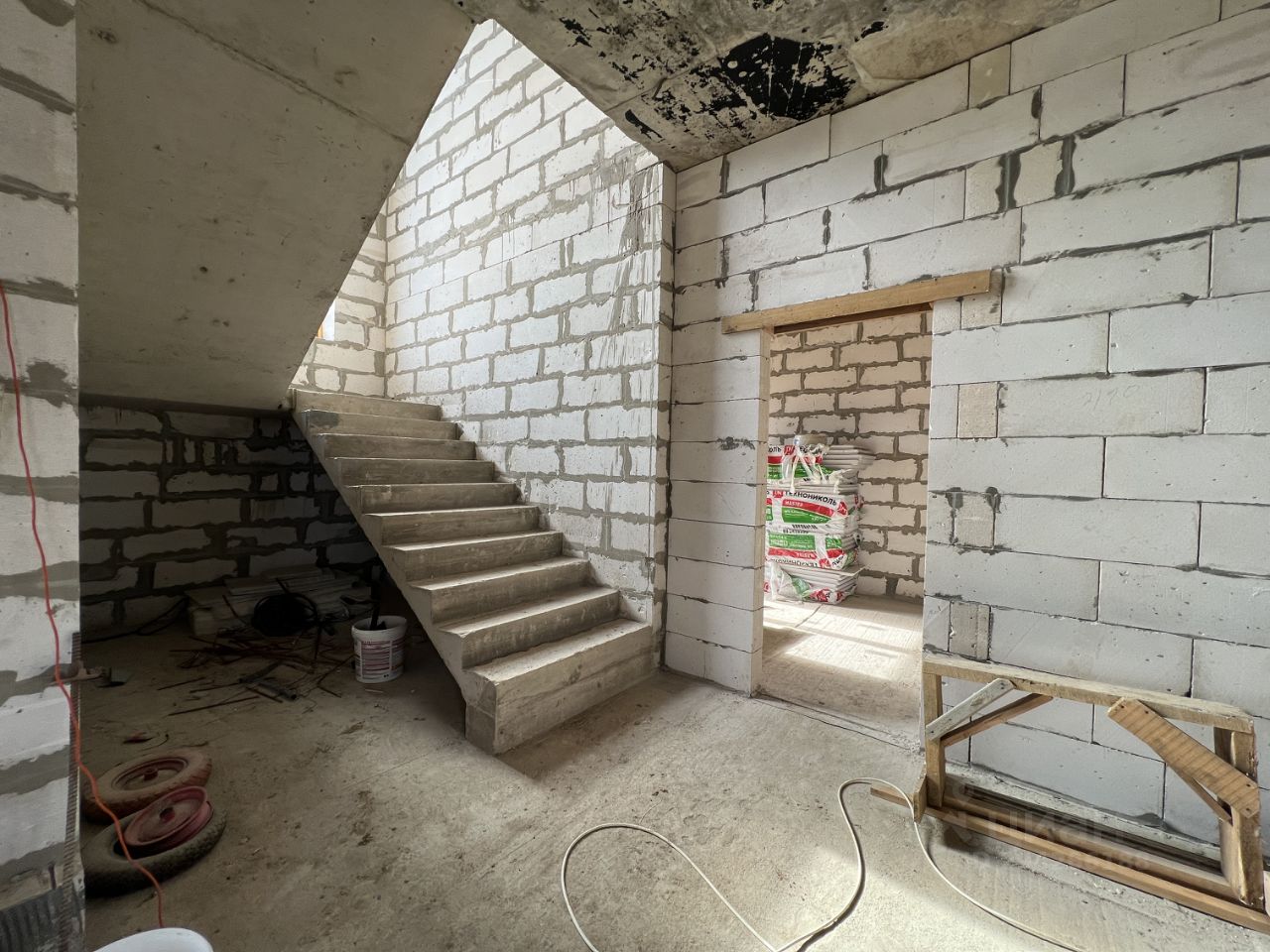 Материал стен дома газосиликатные блоки толщиной 40 см и утеплитель толщиной 5 см. Перекрытия и лестничные марши монолитные. Выполнен железобетонный сейсмопояс, - стены из блоков не несут на себе нагрузки. В окнах двухкамерные стеклопакеты Rehau. Высота потолков 3.25 м. Дом облицован штукатуркой короед и окрашен в глубокий и чистый цвет долговечной дорогостоящей краской. На крыше мягкая кровля и хорошая водосточная система.