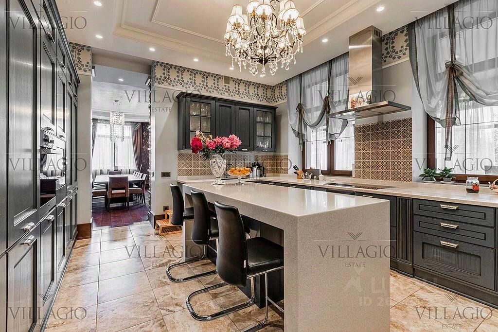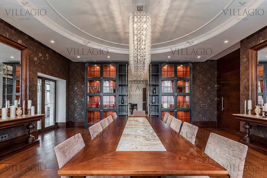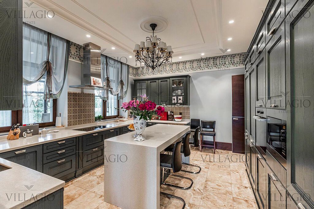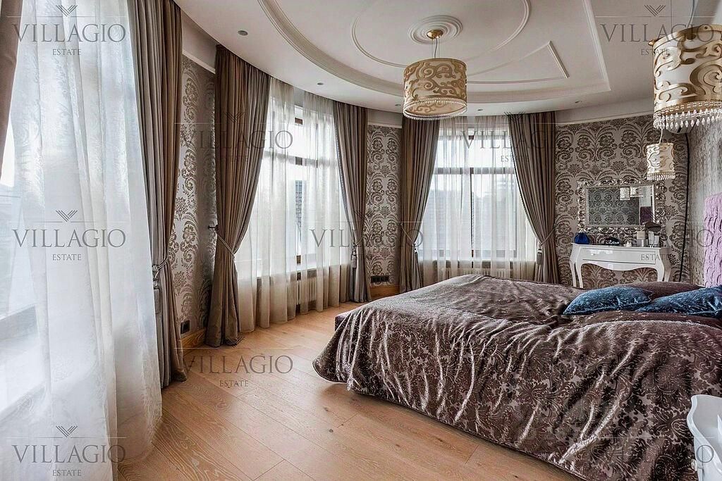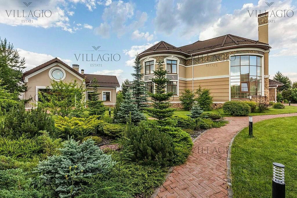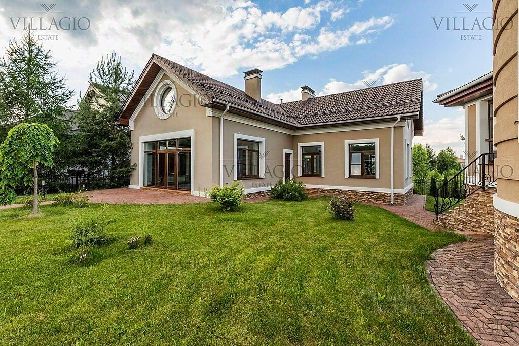 Полностью укомплектованный дом в средиземноморском стиле с фасадами, украшенными авторскими фресками. Полукруглая гостиная, с трех сторон окруженная панорамными окнами, эркерные комнаты, spa-центр с бассейном, сауной и тренажерным залом и застекленная беседка-барбекю, расположенные на просторном участке — основные особенности дома. На первом этаже расположены двусветная гостиная с камином в полукруглой комнате, столовая, кухня, зимний сад, кабинет с с/у прихожая со встроенным гардеробом, холл, с/у, гараж на 2 м/м. На втором этаже — мастер-спальня с с/у и гардеробной, 3 спальни с отдельными с/у, кабинет. В интерьерах преобладают натуральные материалы.