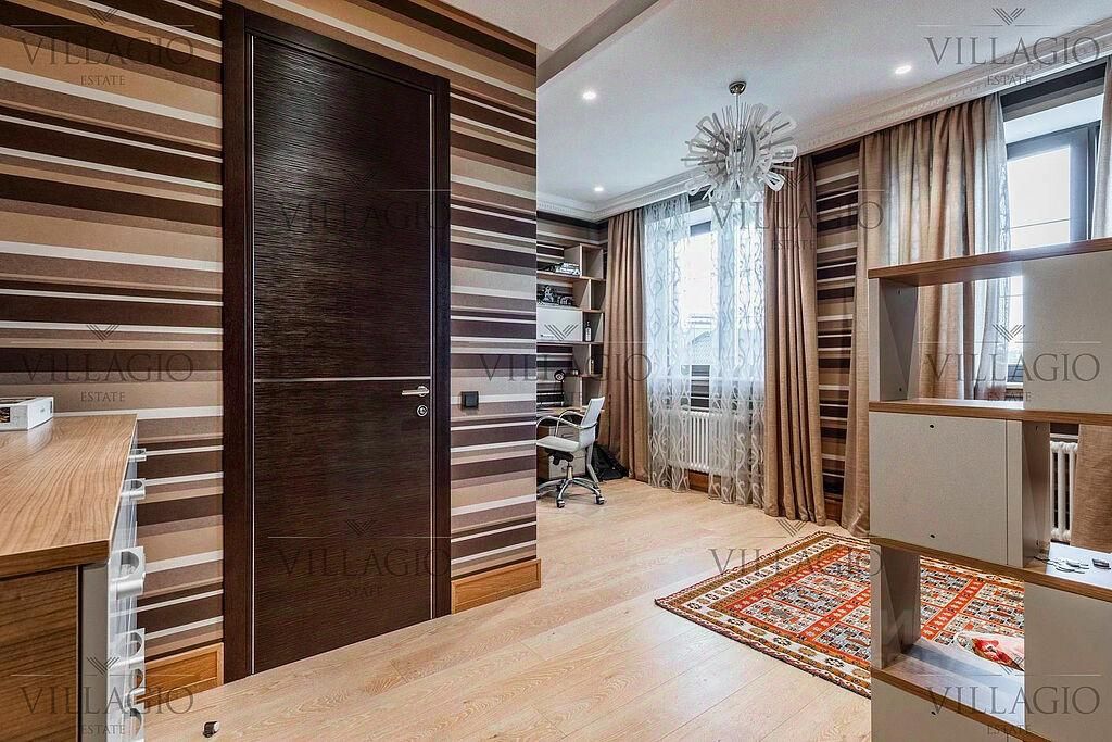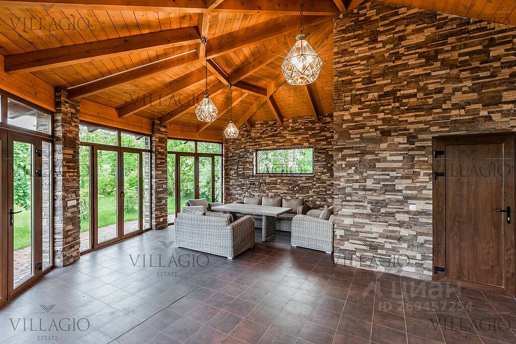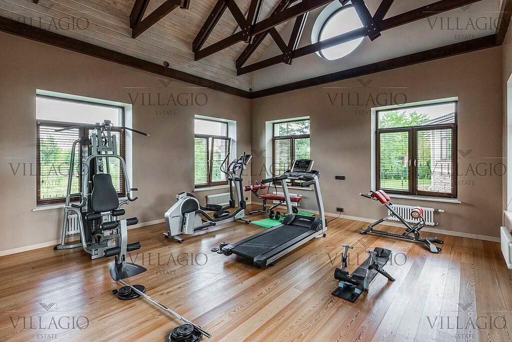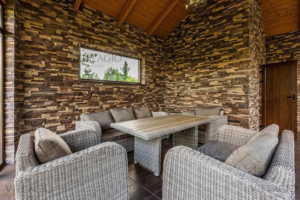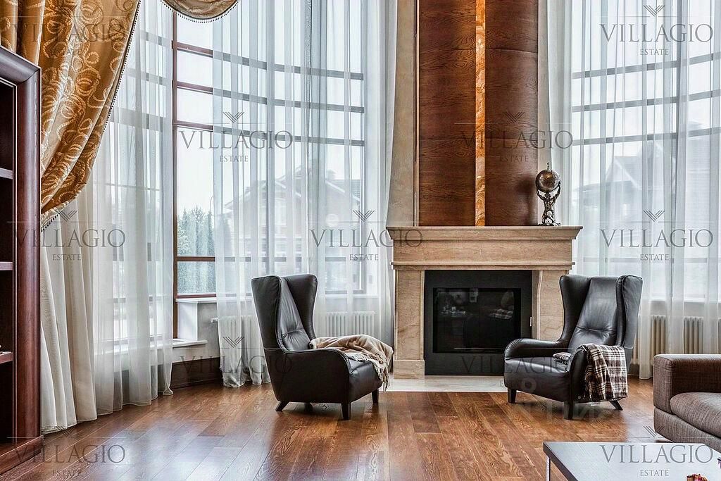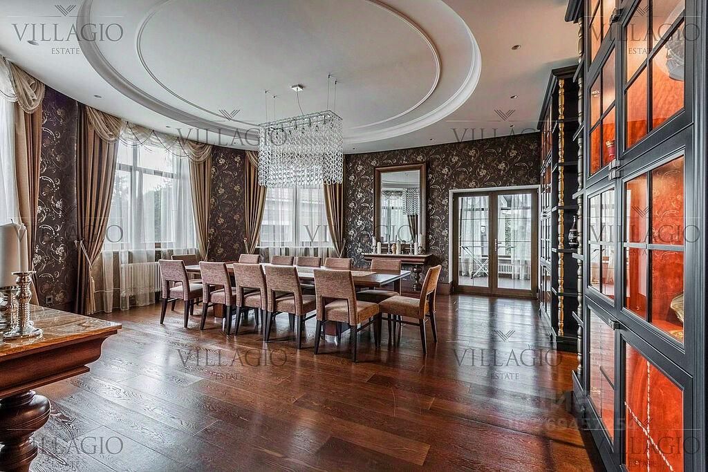 Полностью укомплектованный дом в средиземноморском стиле с фасадами, украшенными авторскими фресками. Полукруглая гостиная, с трех сторон окруженная панорамными окнами, эркерные комнаты, spa-центр с бассейном, сауной и тренажерным залом и застекленная беседка-барбекю, расположенные на просторном участке — основные особенности дома. На первом этаже расположены двусветная гостиная с камином в полукруглой комнате, столовая, кухня, зимний сад, кабинет с с/у прихожая со встроенным гардеробом, холл, с/у, гараж на 2 м/м. На втором этаже — мастер-спальня с с/у и гардеробной, 3 спальни с отдельными с/у, кабинет. В интерьерах преобладают натуральные материалы.