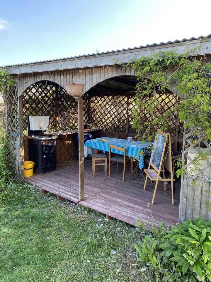 В беседке: сделан подвод и отвод воды в рукомойнике, с системой нагрева воды от солнца.