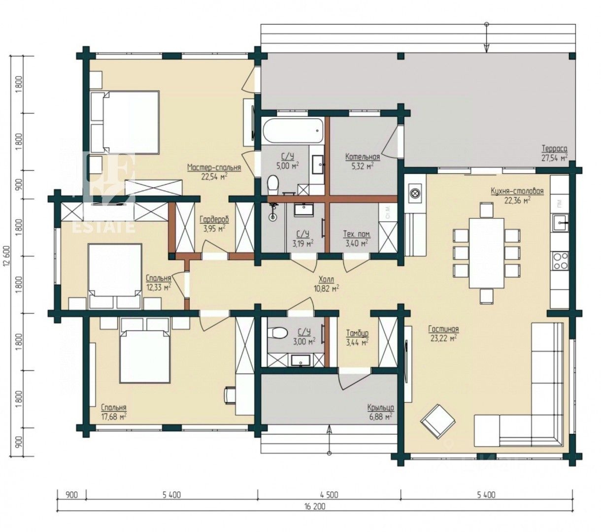 Терраса, зал-кухня-гостиная, гардеробная, санузел с душевой (раздельный), спальня гостевая, спальня детская, мастер-спальня с гардеробной и санузлом с ванной, котельная