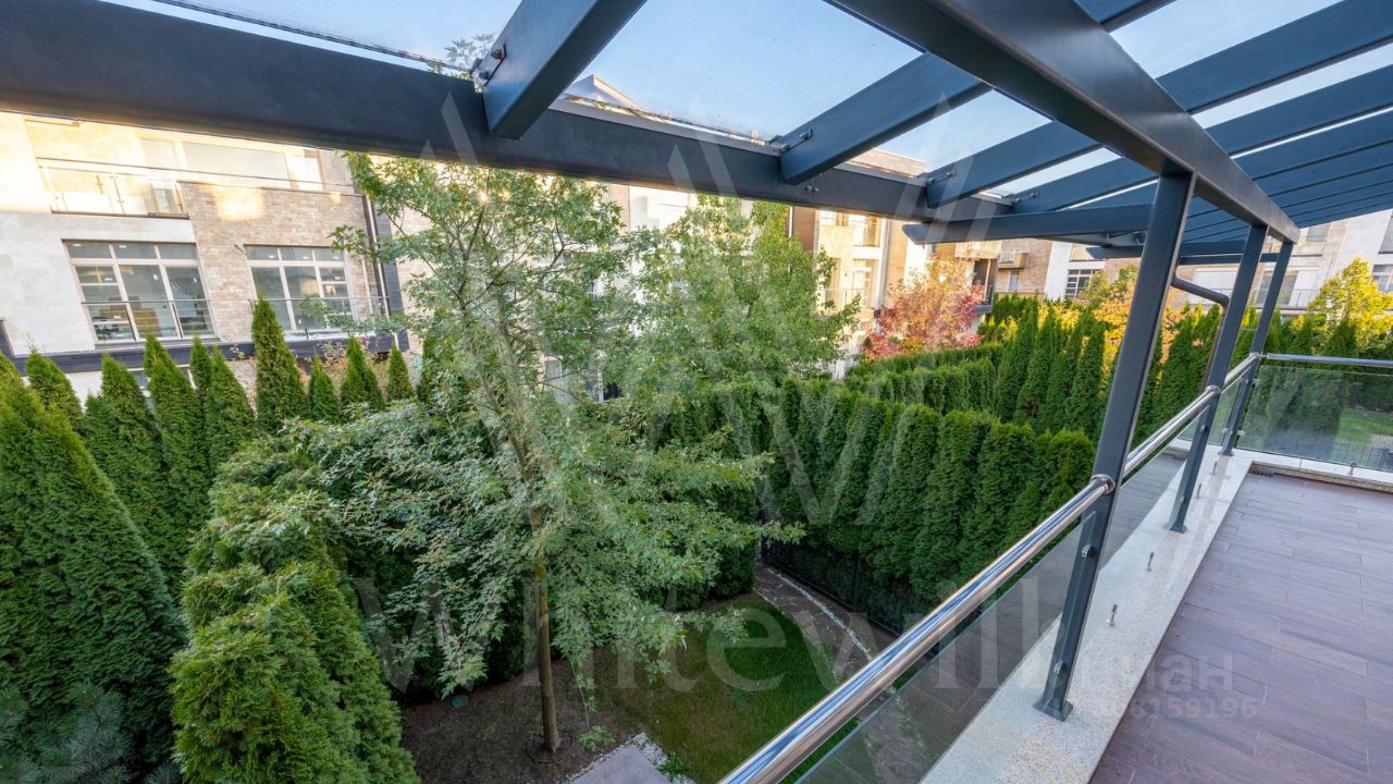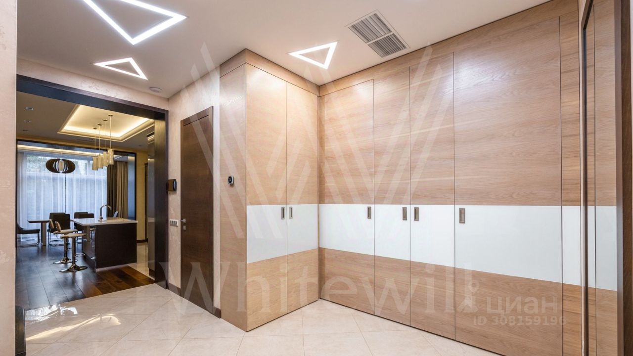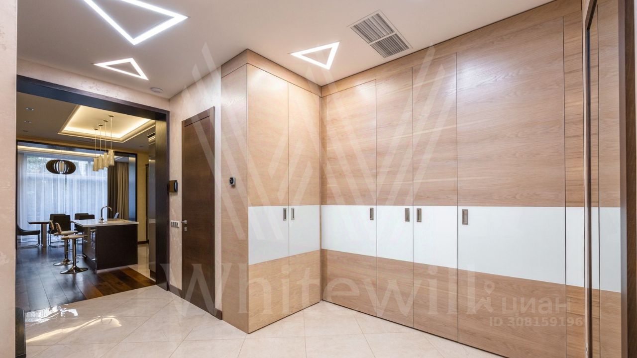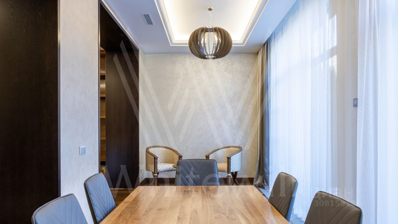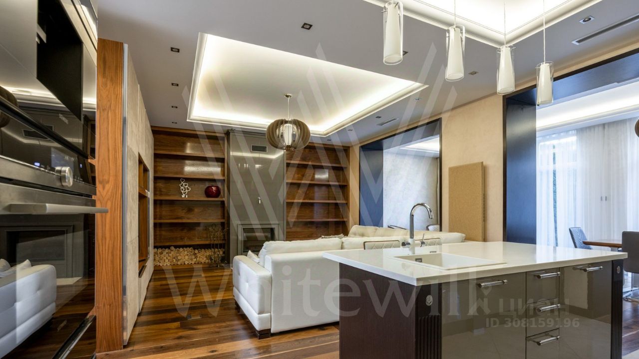 ID 11 826. Park Avenue. Таунхаус площадью 310 м² расположен на полевом участке 2,7 сотки. Фасад в райтовском стиле облицован травертином, лиственницей и мрамором. В отделке современного интерьера использованы дорогостоящие материалы, установлена мебель и система ''умный дом''. Планировка дома включает 5 спален, просторную кухню-гостиную с камином, столовую с выходом на участок и кабинет. В контуре резиденции расположен гараж. На участке выполнен ландшафтный дизайн, по периметру высажены туи и вымощены дорожки.