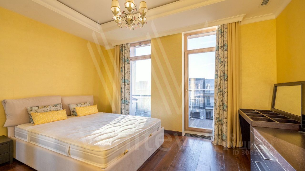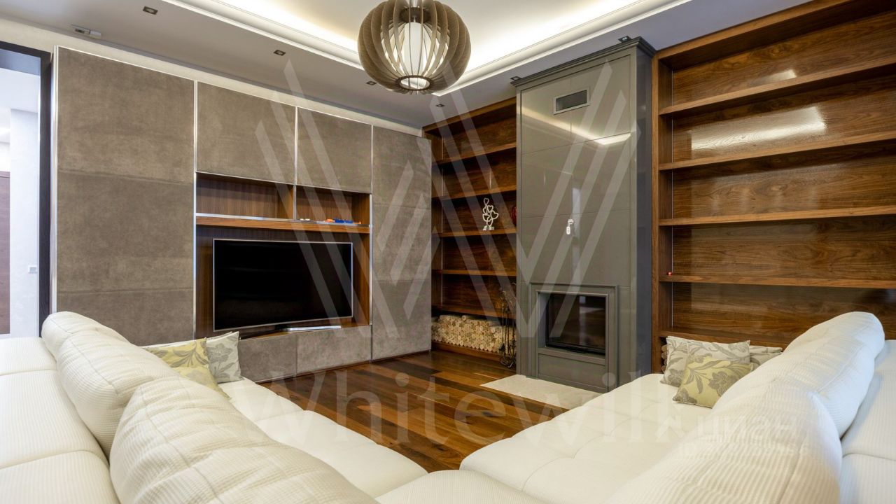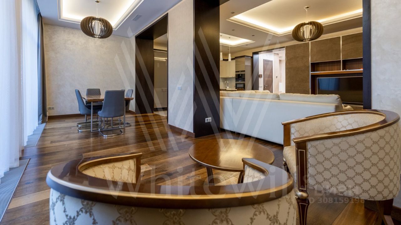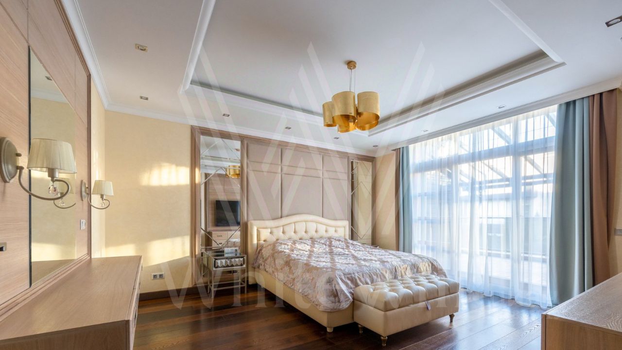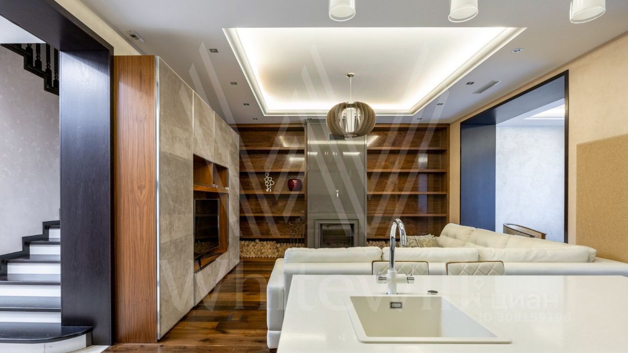 ID 11 826. Park Avenue. Таунхаус площадью 310 м² расположен на полевом участке 2,7 сотки. Фасад в райтовском стиле облицован травертином, лиственницей и мрамором. В отделке современного интерьера использованы дорогостоящие материалы, установлена мебель и система ''умный дом''. Планировка дома включает 5 спален, просторную кухню-гостиную с камином, столовую с выходом на участок и кабинет. В контуре резиденции расположен гараж. На участке выполнен ландшафтный дизайн, по периметру высажены туи и вымощены дорожки.