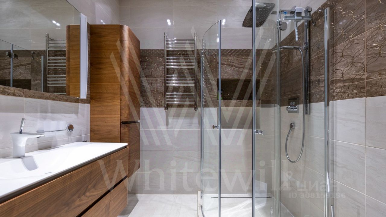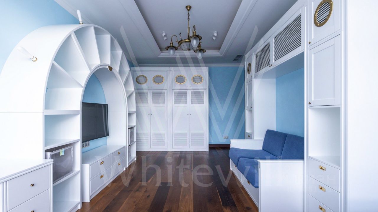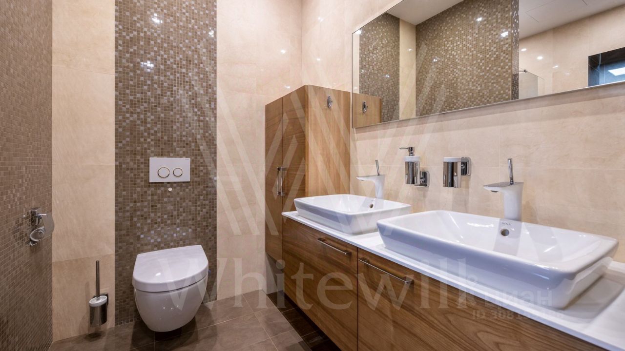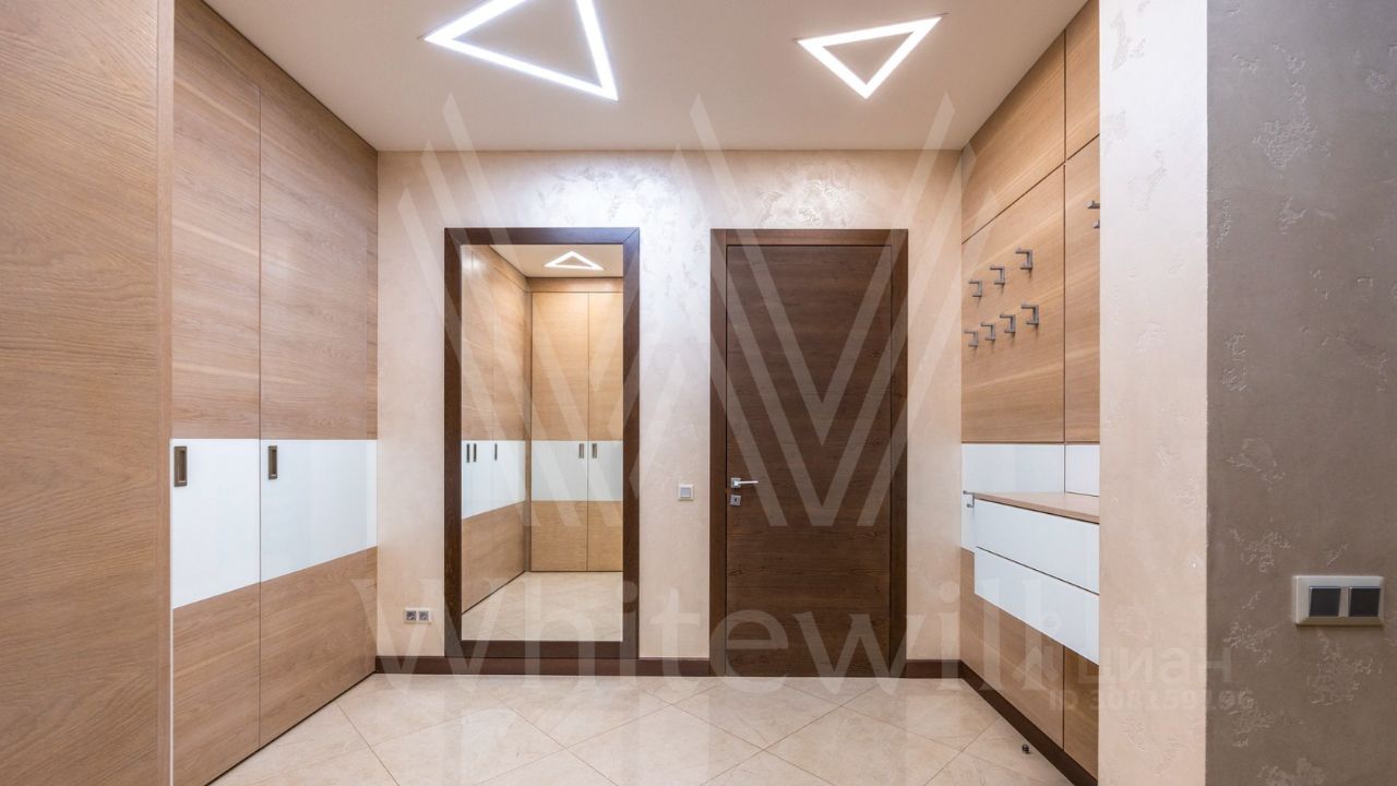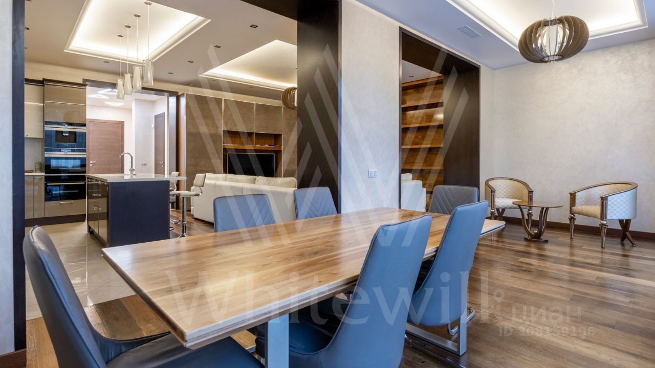 ID 11 826. Park Avenue. Таунхаус площадью 310 м² расположен на полевом участке 2,7 сотки. Фасад в райтовском стиле облицован травертином, лиственницей и мрамором. В отделке современного интерьера использованы дорогостоящие материалы, установлена мебель и система ''умный дом''. Планировка дома включает 5 спален, просторную кухню-гостиную с камином, столовую с выходом на участок и кабинет. В контуре резиденции расположен гараж. На участке выполнен ландшафтный дизайн, по периметру высажены туи и вымощены дорожки.