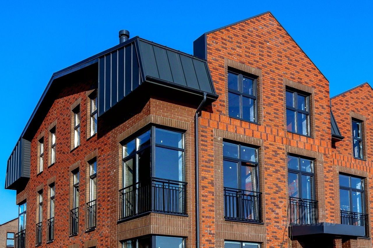 Материал стен экологичный керамический блок Poroterm. Отделка фасадов керамический облицовочный кирпич Kerma Premium. Все окна двух этажей и мансарды в пол (французские балконы). Ламинированные двухкамерные стеклопакеты из профиля ПВХ под текстуру дерева. Фальцевая кровля Кликфальц от Grand Line с полимерным покрытием в тёмных тонах. В мансарде полноценная высота потолка - более 3х метров.