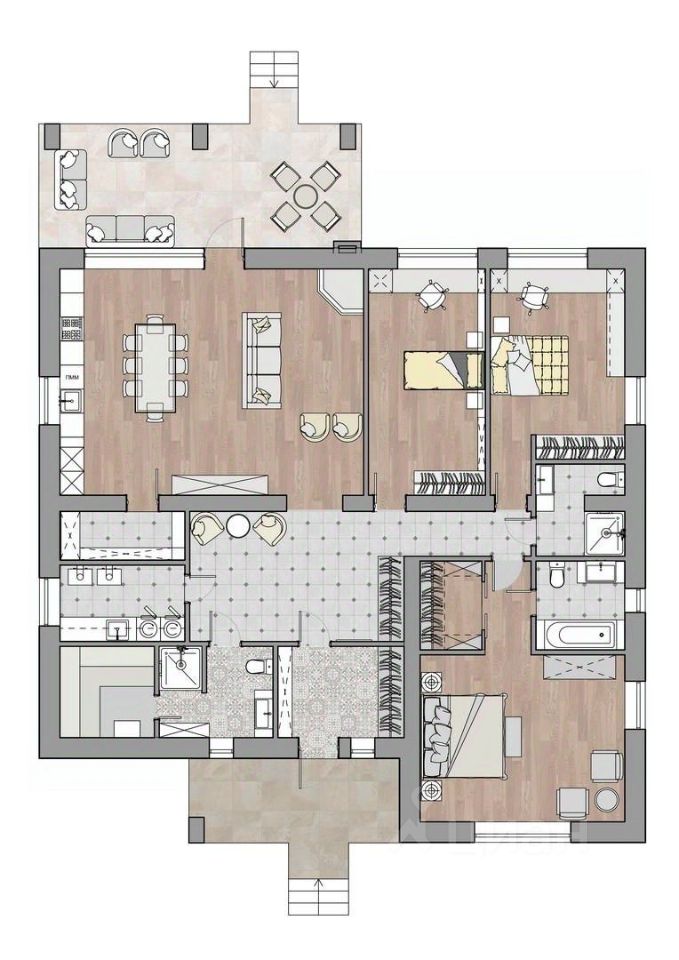 ОСНОВНЫЕ ХАРАКТЕРИСТИКИ - Общая площадь: 197.45 м² - Площадь участка: 9.98 сот. - 1 этаж - 3 спальни - 3 ванные комнаты - Терраса: 25.