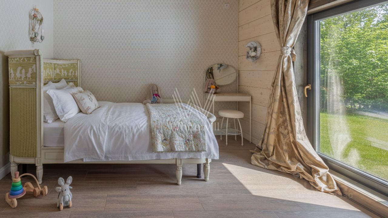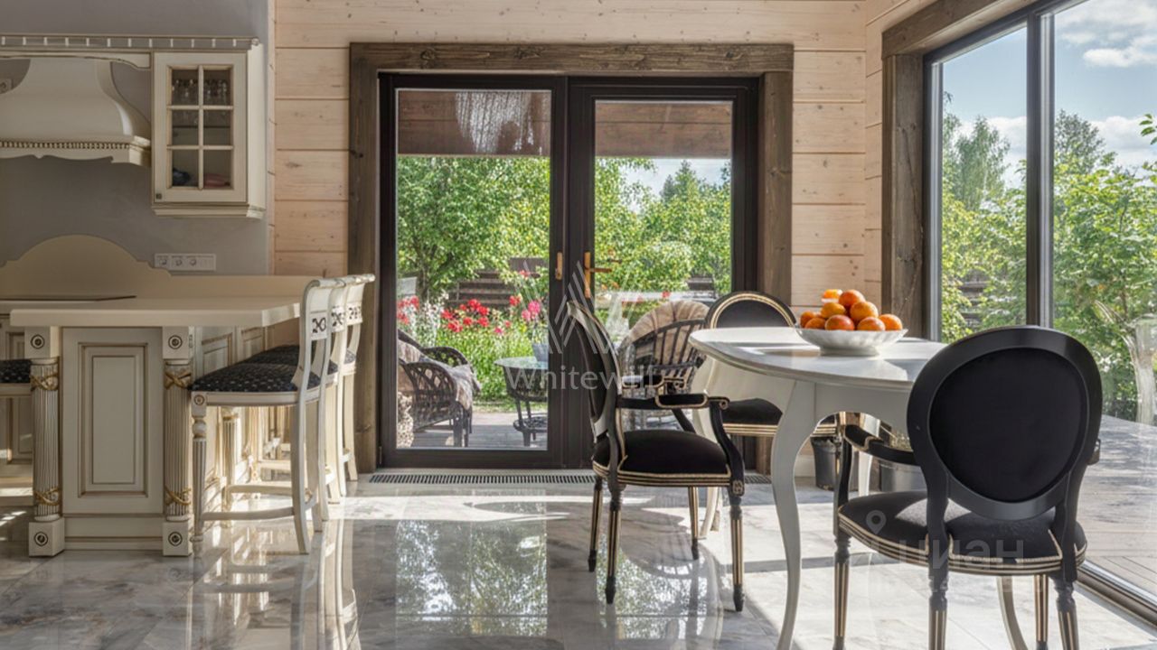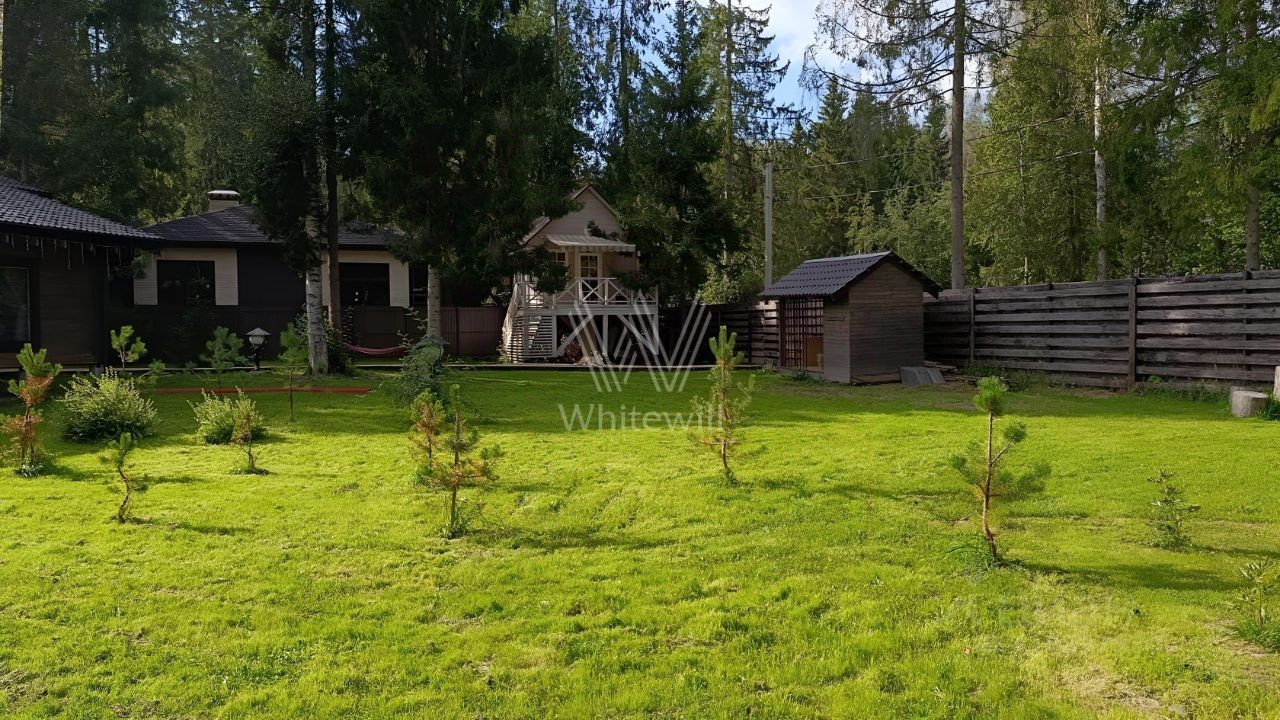 Лесницыно. Уютный загородный дом площадью 224 м² расположен на просторном лесном участке 18 соток. Фасад здания с большими окнами выполнен из клееного бруса в стиле шале. Коттедж представлен с отделкой под ключ. Здесь разместили эффектуню двухсветную гостиную-кухню с камином, три уютные спальни, и террасу. Кроме того, на территории расположен детский домик-мастерская. На участке с дренажными работами можно выполнить ландшафтный дизайн, засеять газон и обустроить зону отдыха.