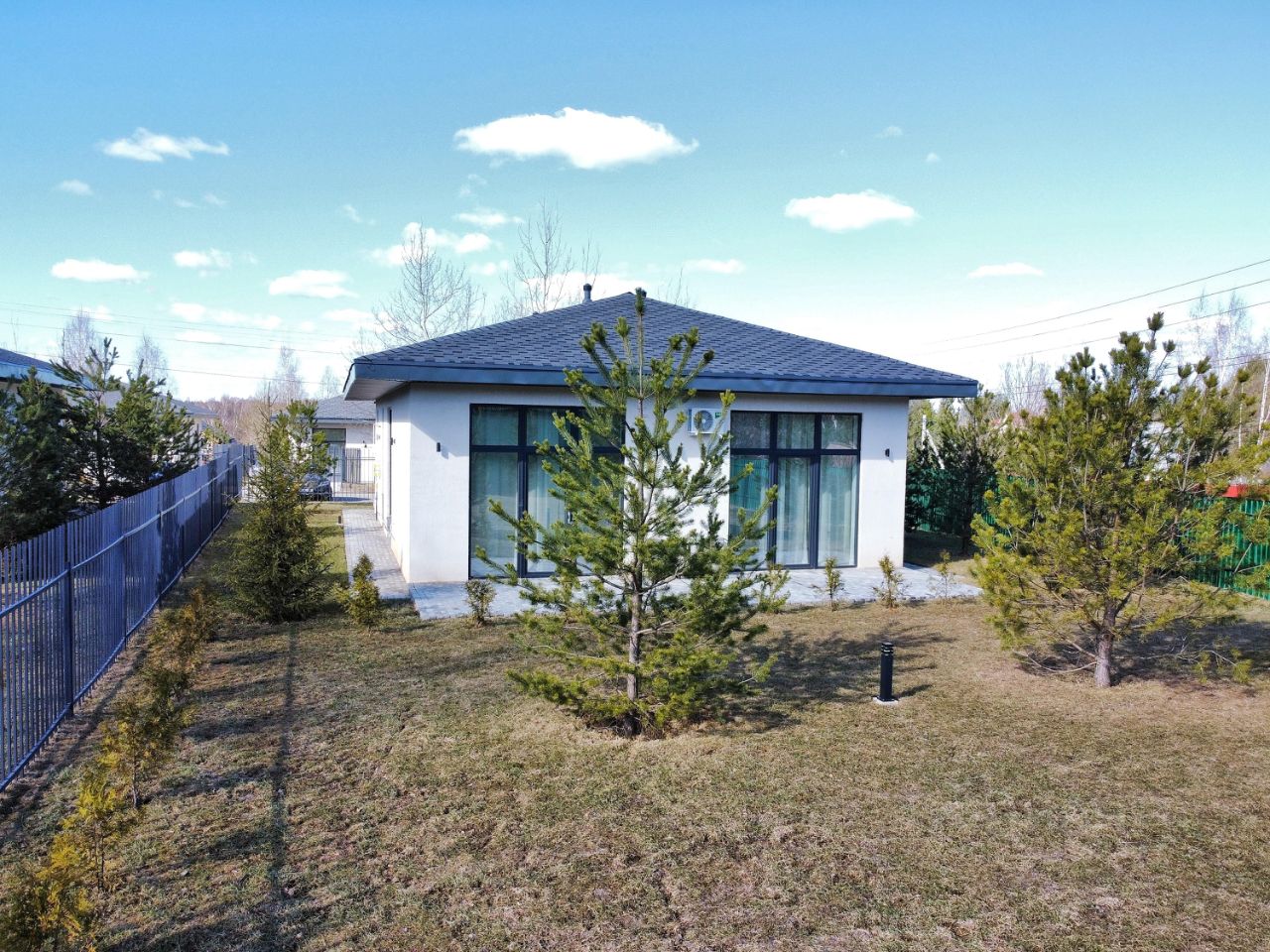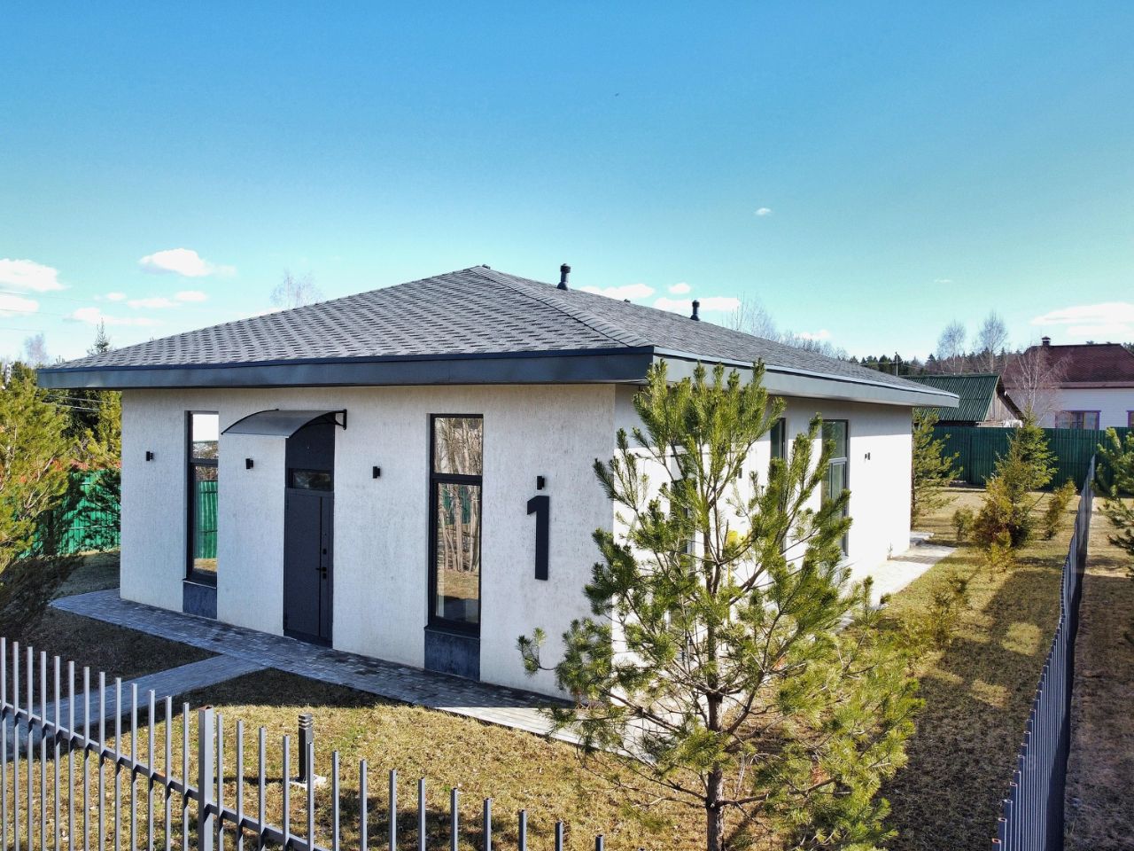 Дом включает четыре спальни и два санузла, а также просторную кухню-гостиную с панорамными окнами. При входе в дом расположена гардеробная, а также котельная.