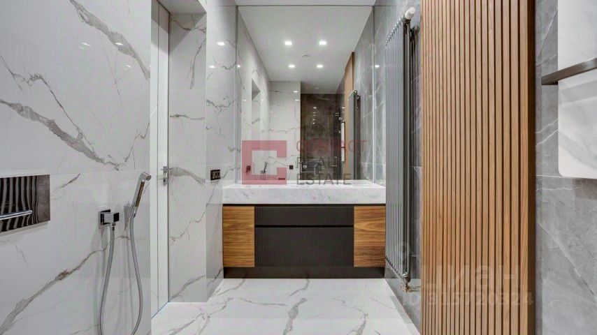 ID 541863. КП Монтевиль. Новый современный дом в элитном коттеджном поселке. Современный фасад с панорамными окнами облицован камнем и деревом. Интерьер выдержан в светлых оттенках, полы выполнены из керамогранита и орехового паркета, ванные комнаты оборудованы сантехникой Villeroy&Boch. Планировка дома: 1 этаж: прихожая, гардеробная, гостевой санузел, гостиная, столовая, кухня, спальня, гараж на два машиноместа,