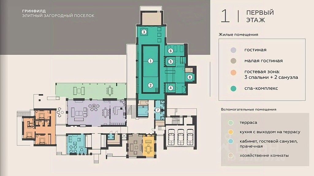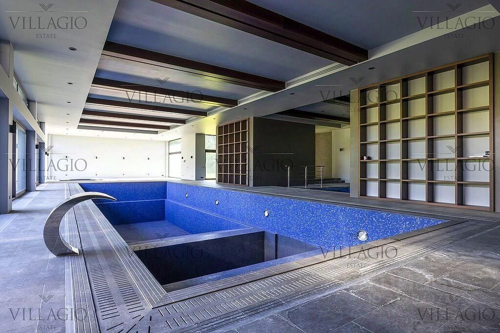 На первом этаже гостиная, столовая, кухня с выходами на большую террасу, малая гостиная, кабинет, гостевой санузел, прачечная, две комнаты для хознужд, гостевая зона с тремя спальнями и двумя санузлами, а также большая спа-зона: 15-метровый бассейн, бассейн с холодной водой, джакузи, паровая кабина, сауна, солевая комната, тренажерный зал, два санузла.