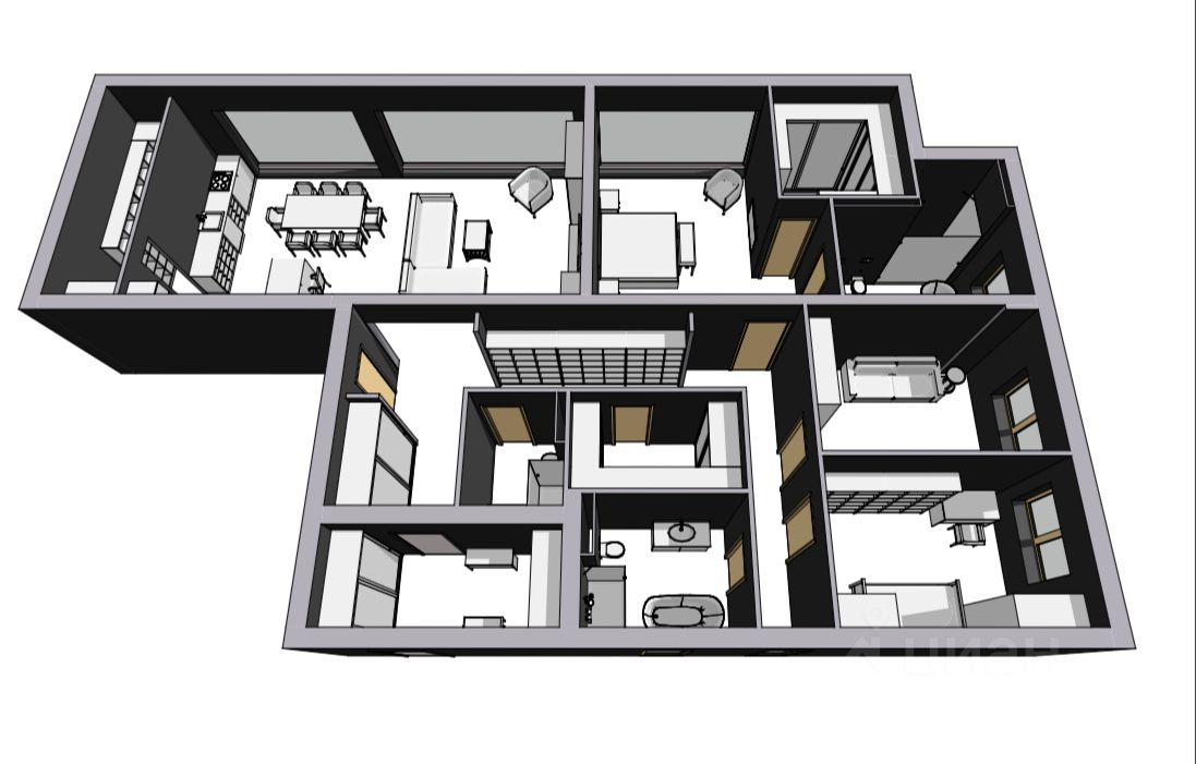 В доме предусмотрены: входная группа, гостиная, совмещенная с кухней и столовой зоной и выходом на патио, гардеробная, санузел, постирочная, мастер-спальня с санузлом и гардеробной, 2 спальни, гараж на 2 авто, бойлерная.