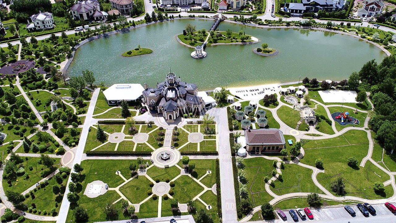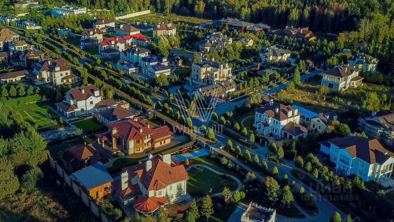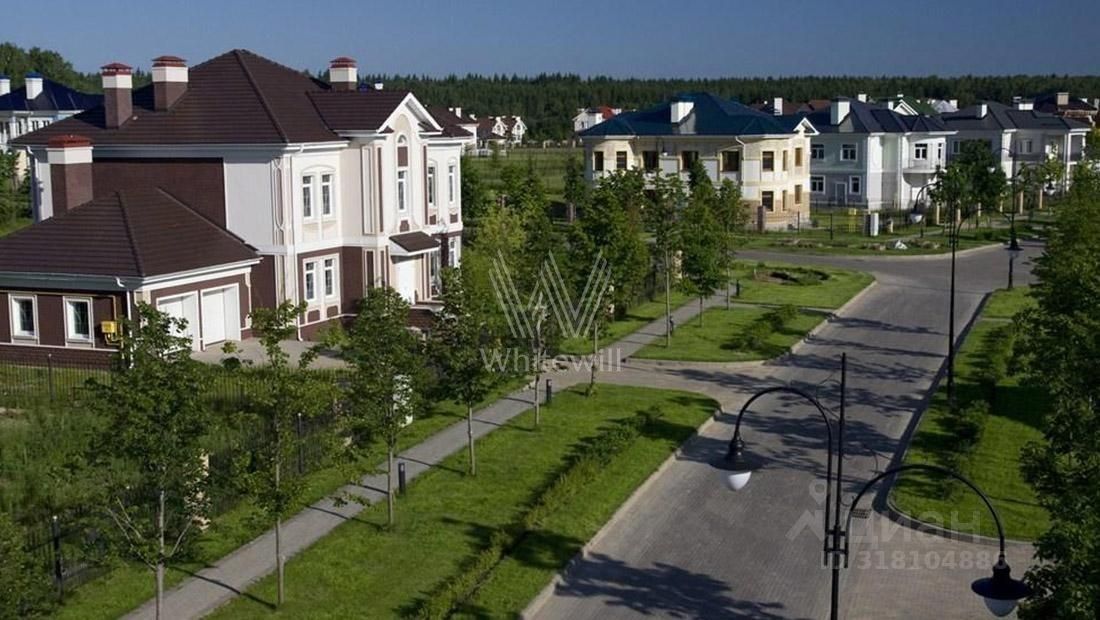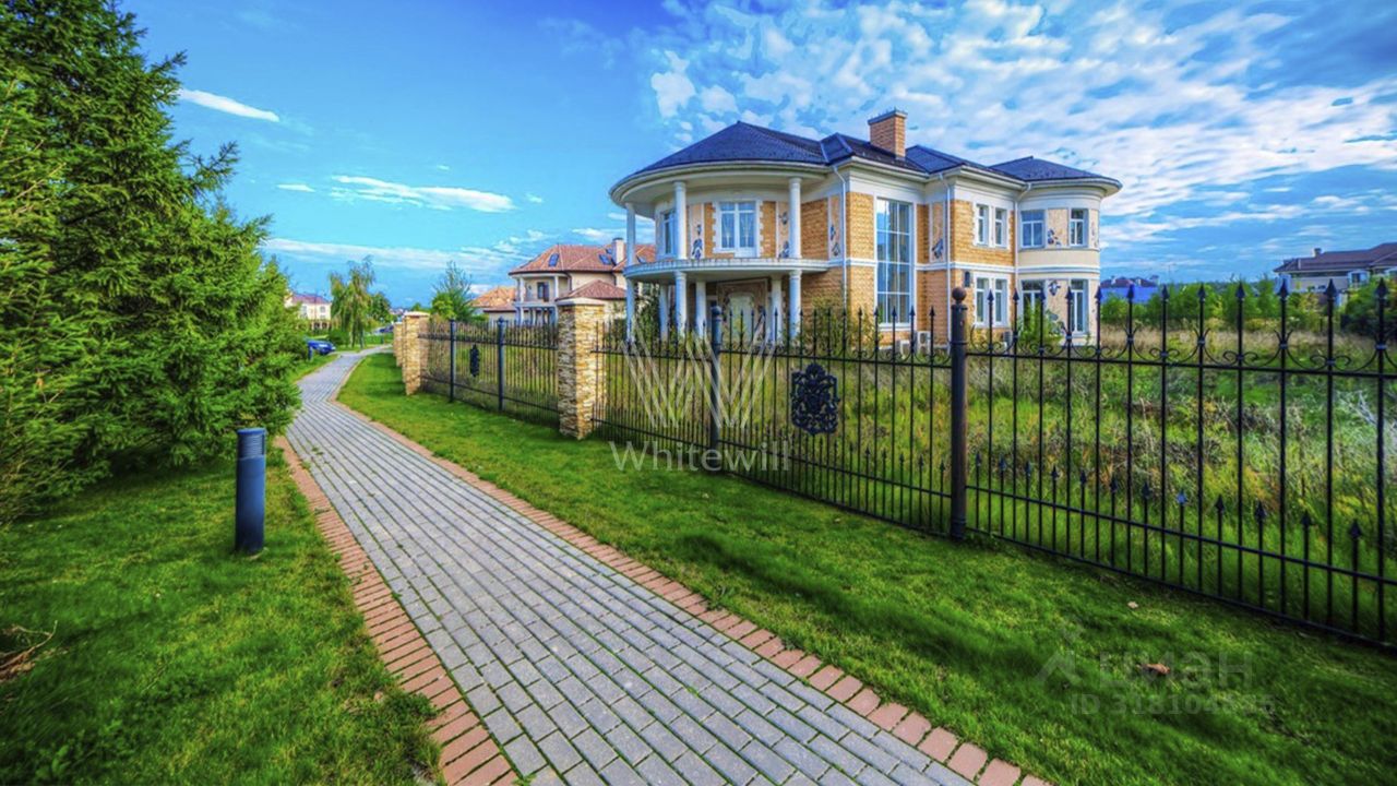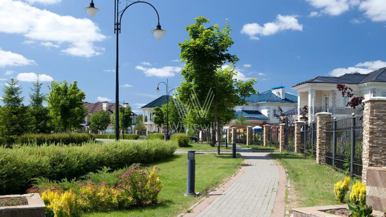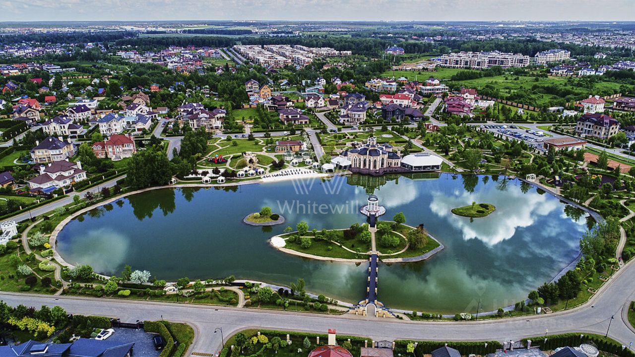 Гринфилд. Резиденция в неоклассическом стиле площадью 420 м² расположена на полевом участке 20 соток. Фасад отличается двухсветным панорамным остеклением, выходящим на участок. Интерьер оформили в классическом стиле в бежево-голубых тонах. На первом этаже большая гостиная с камином и роялем. В отделке использовали натуральный мрамор, ценные породы дерева и стекло. Каждая из 3 спален обставлена дизайнерской мебелью, дополнена зеркалами, картинами и другими предметами декора. На участке создали английский парк с мощеными дорожками и аккуратными декоративными кустарниками. Около дома — летняя беседка-ротонда с печью для барбекю.