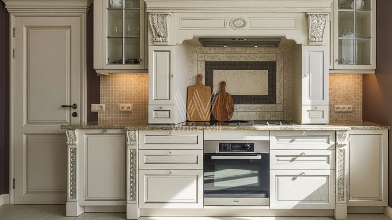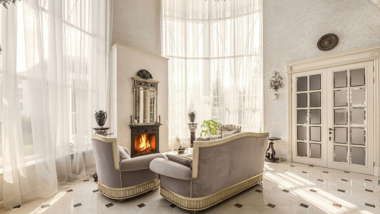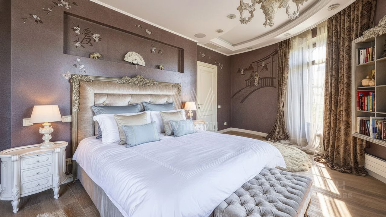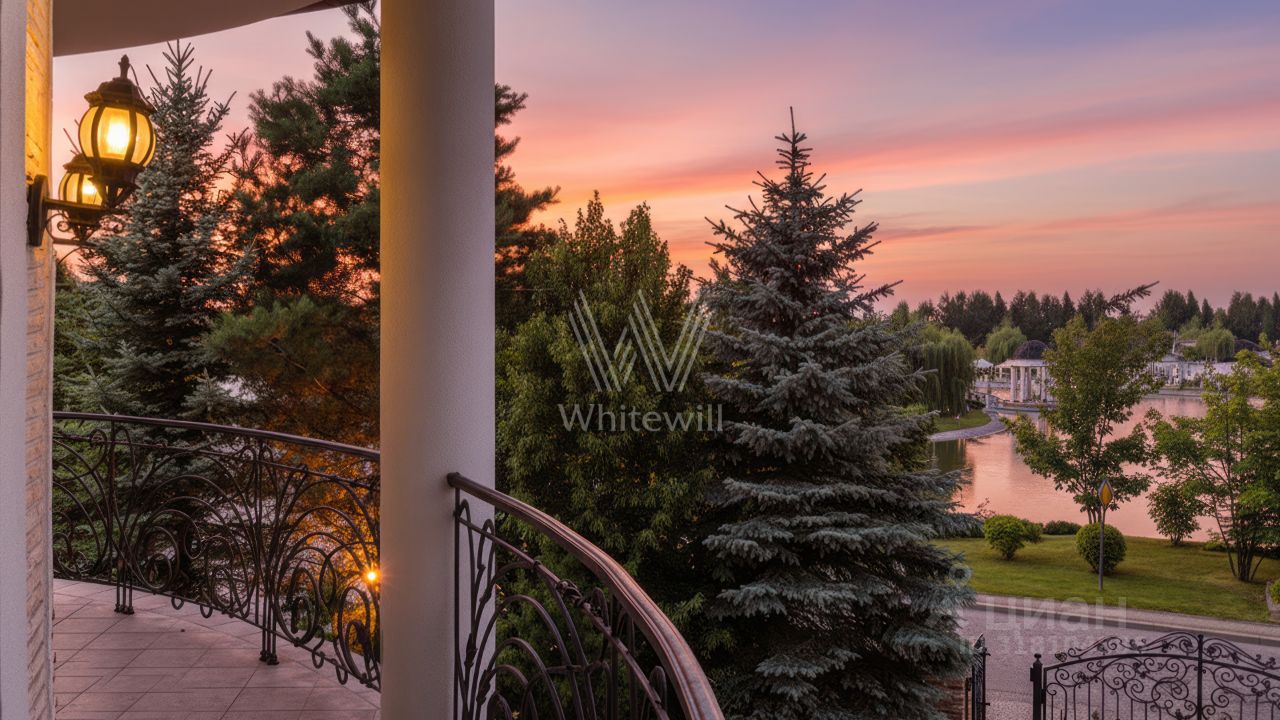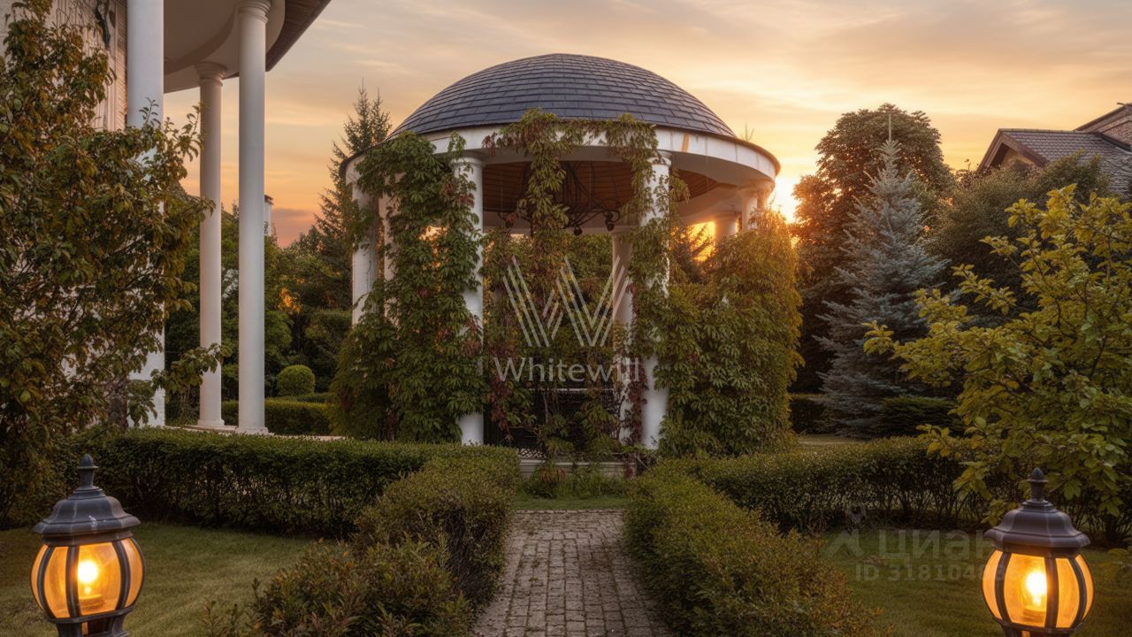 Гринфилд. Резиденция в неоклассическом стиле площадью 420 м² расположена на полевом участке 20 соток. Фасад отличается двухсветным панорамным остеклением, выходящим на участок. Интерьер оформили в классическом стиле в бежево-голубых тонах. На первом этаже большая гостиная с камином и роялем. В отделке использовали натуральный мрамор, ценные породы дерева и стекло. Каждая из 3 спален обставлена дизайнерской мебелью, дополнена зеркалами, картинами и другими предметами декора. На участке создали английский парк с мощеными дорожками и аккуратными декоративными кустарниками. Около дома — летняя беседка-ротонда с печью для барбекю.