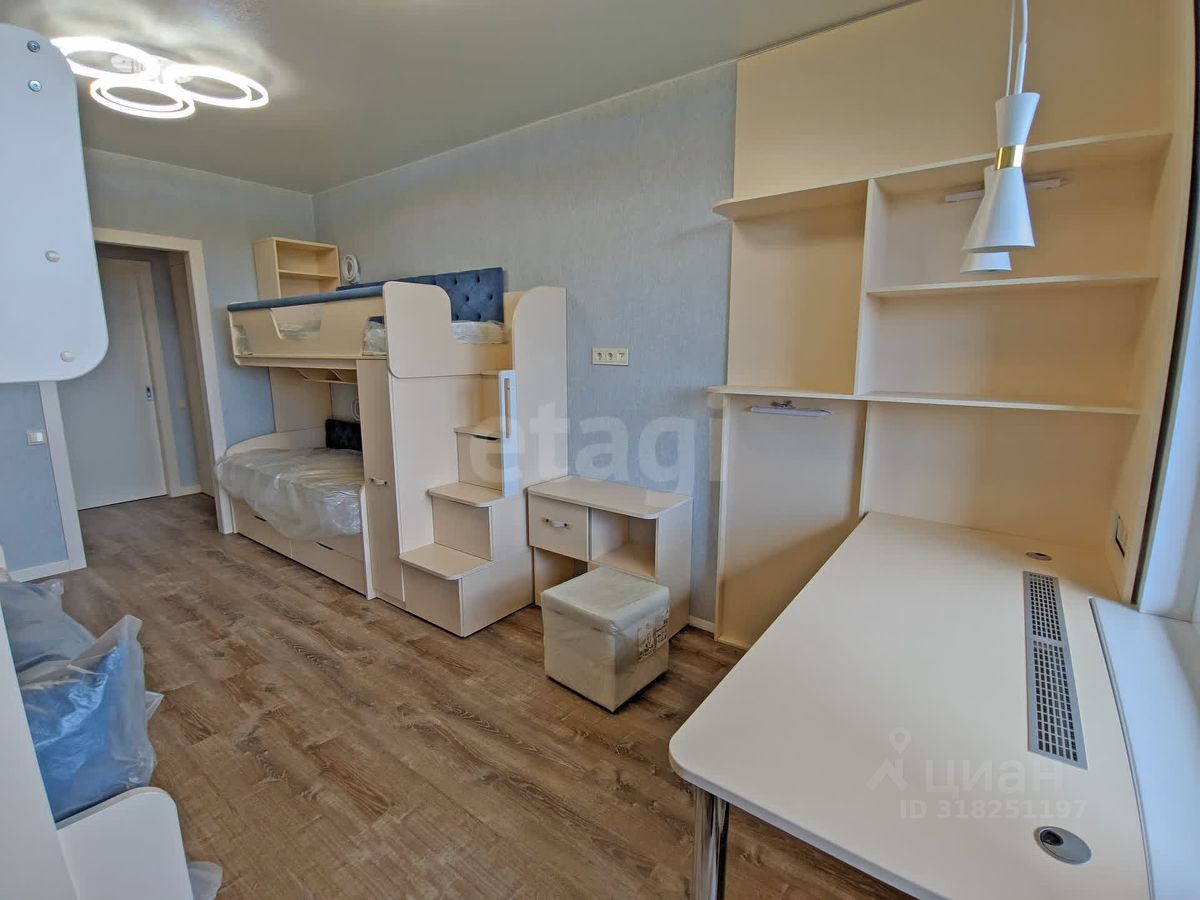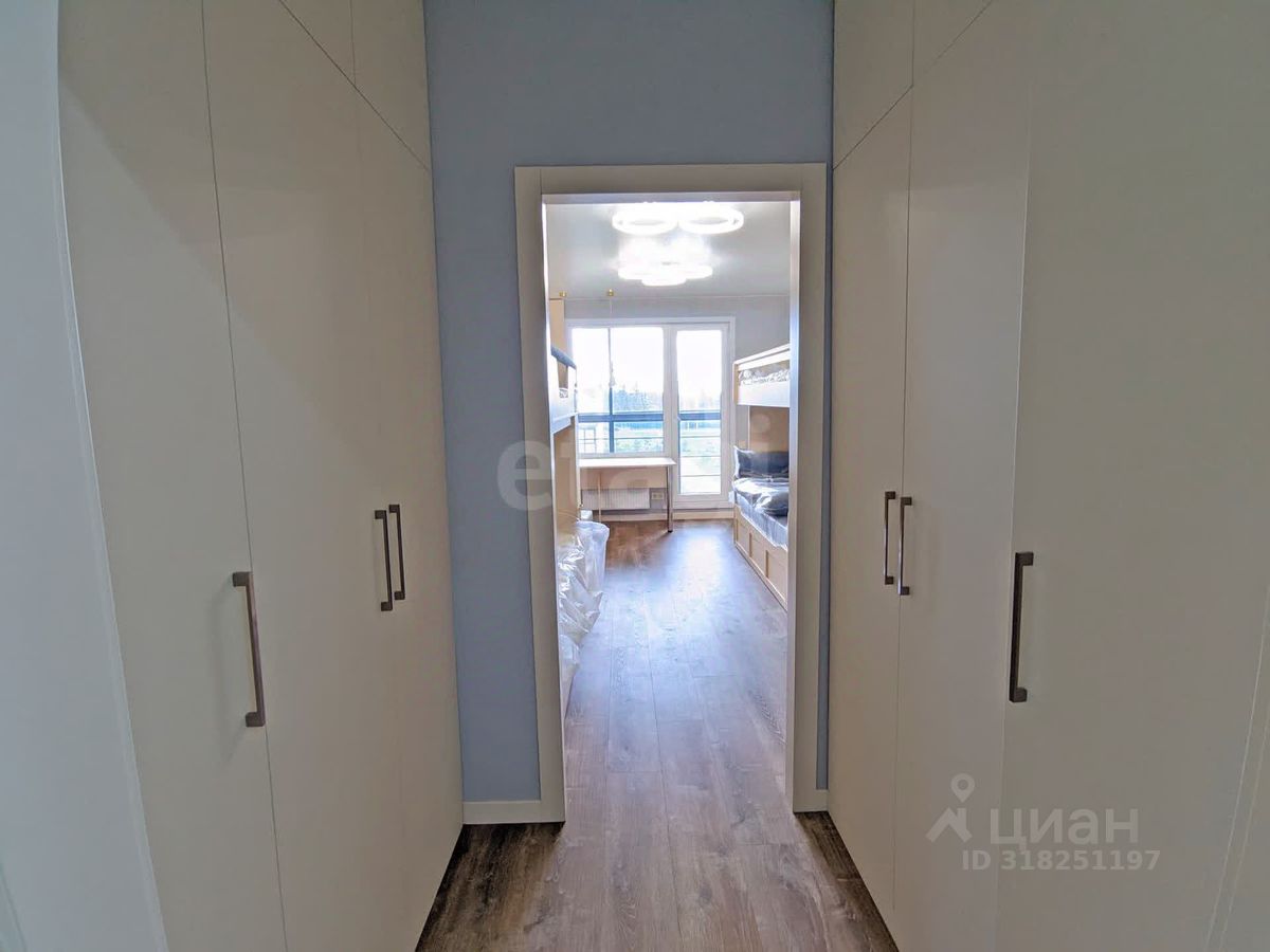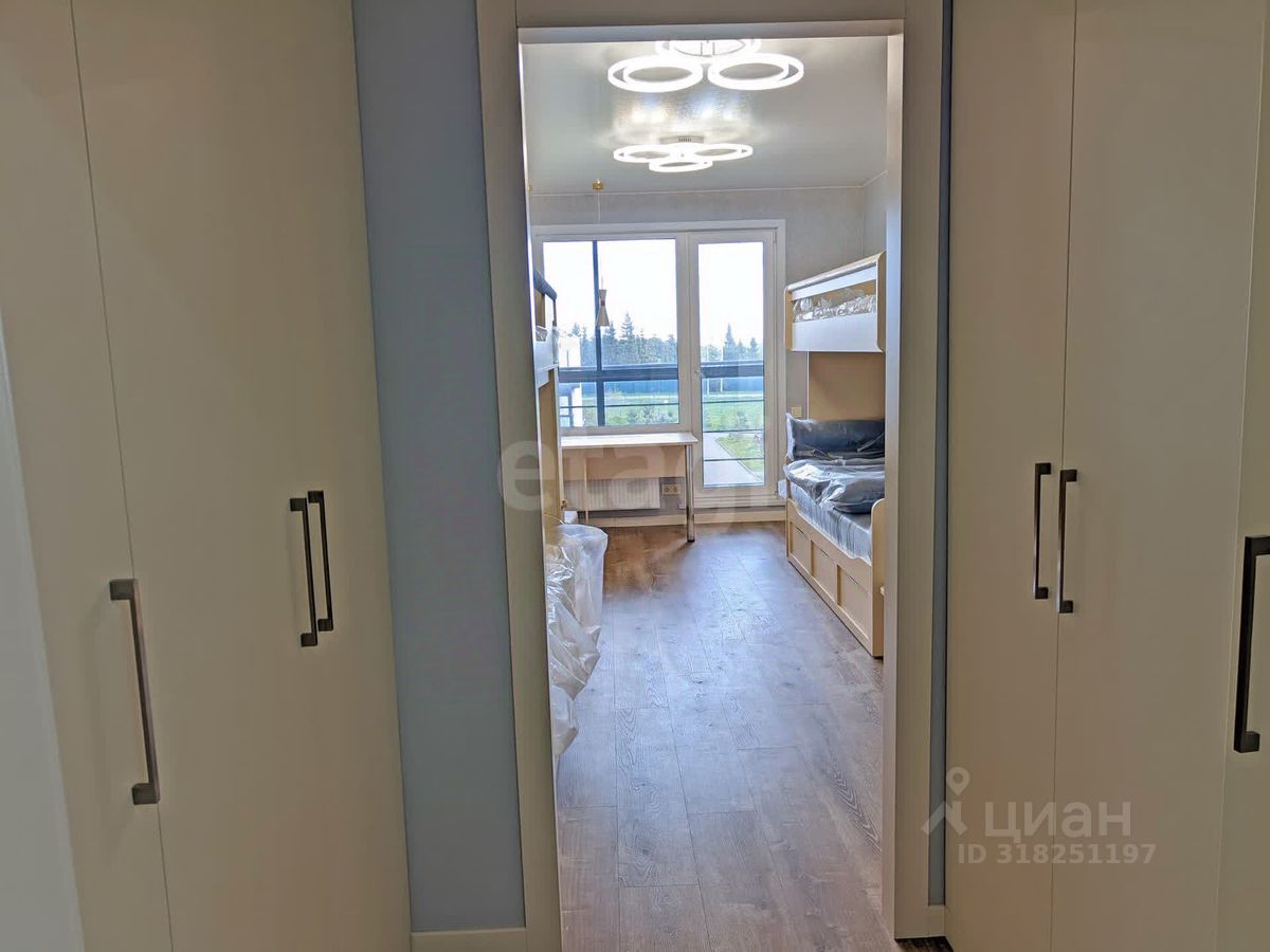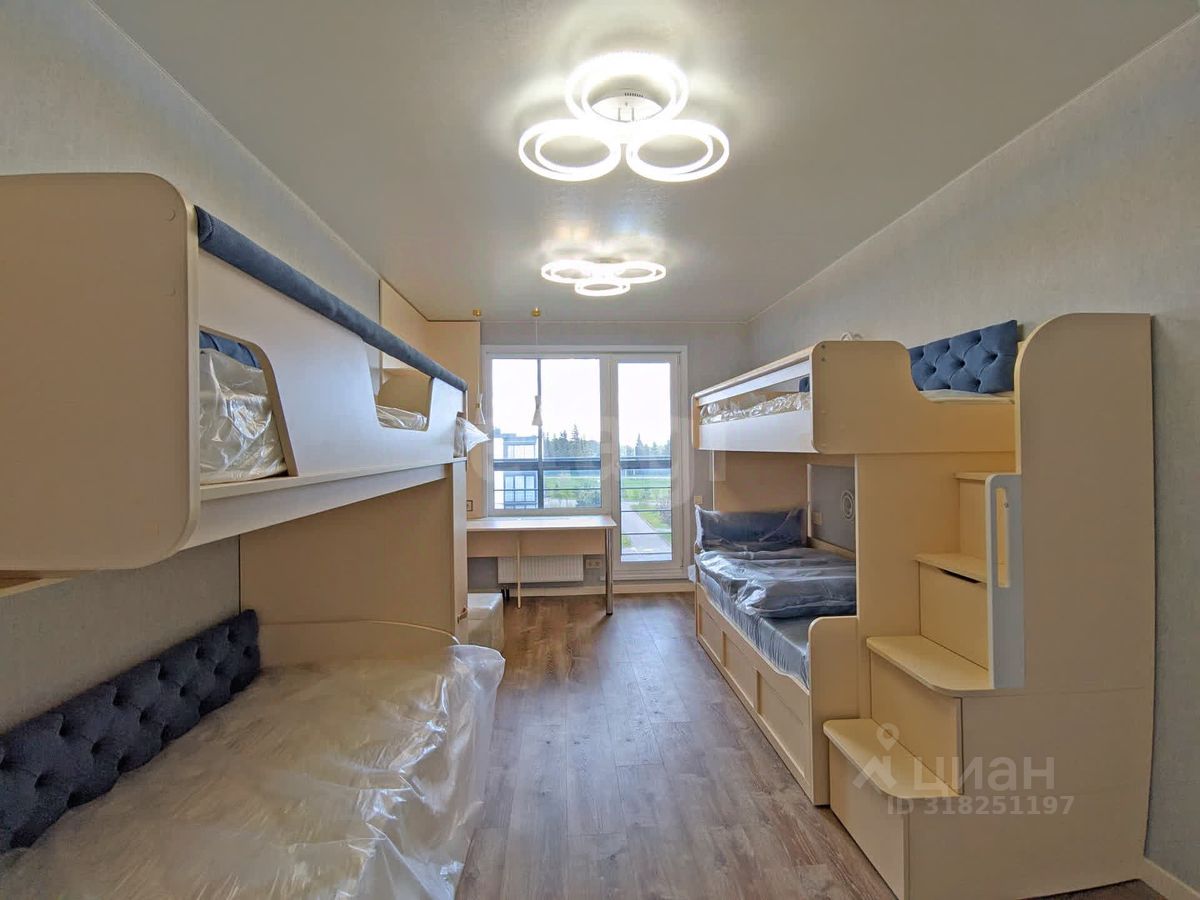 Планировка для большой семьи: • Просторная гостиная с ТВ • Спальня с гардеробной и разноцветной подсветкой по периметру • Детская с гардеробной: 4 кровати и зона под спортивный уголок • Панорамные окна с видами на природу и дальние корпуса ЖК • Просторный балкон с отделкой из липы с обзором детской площадки