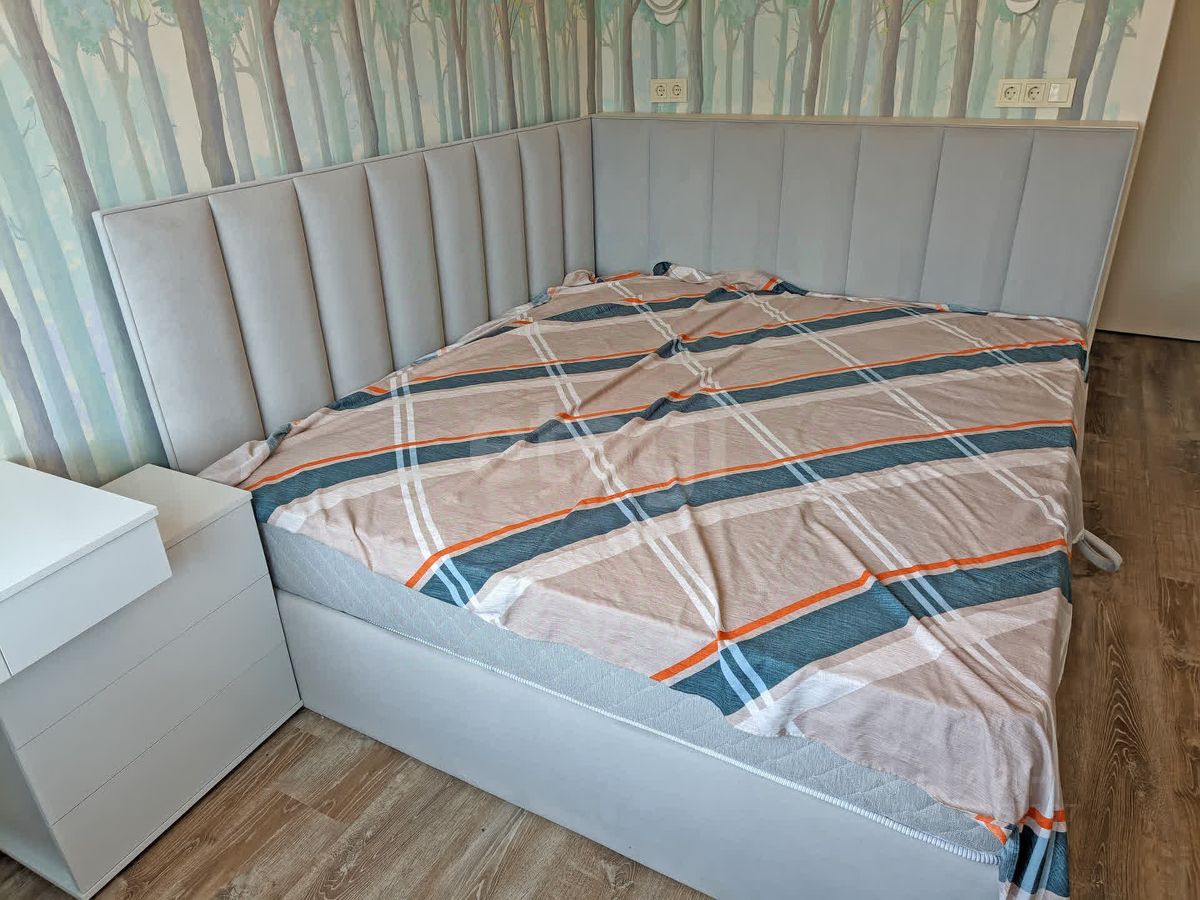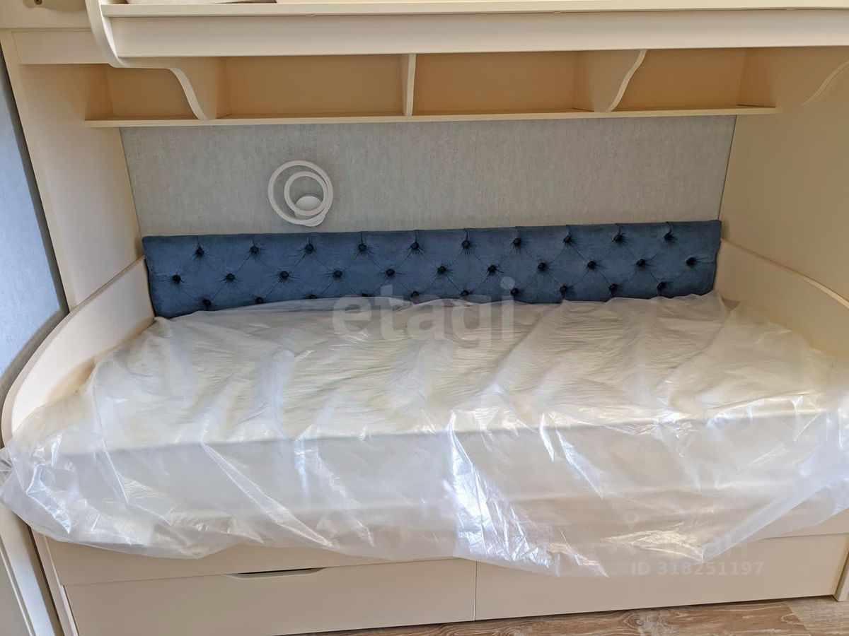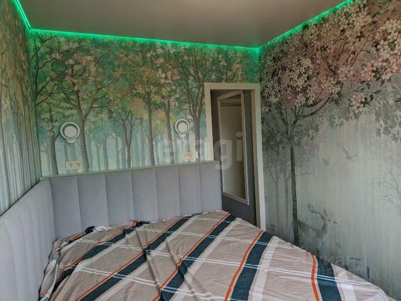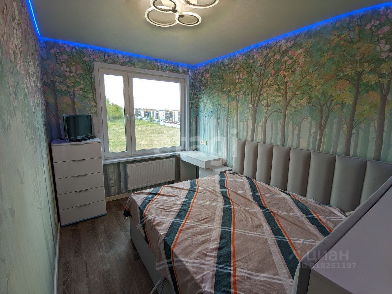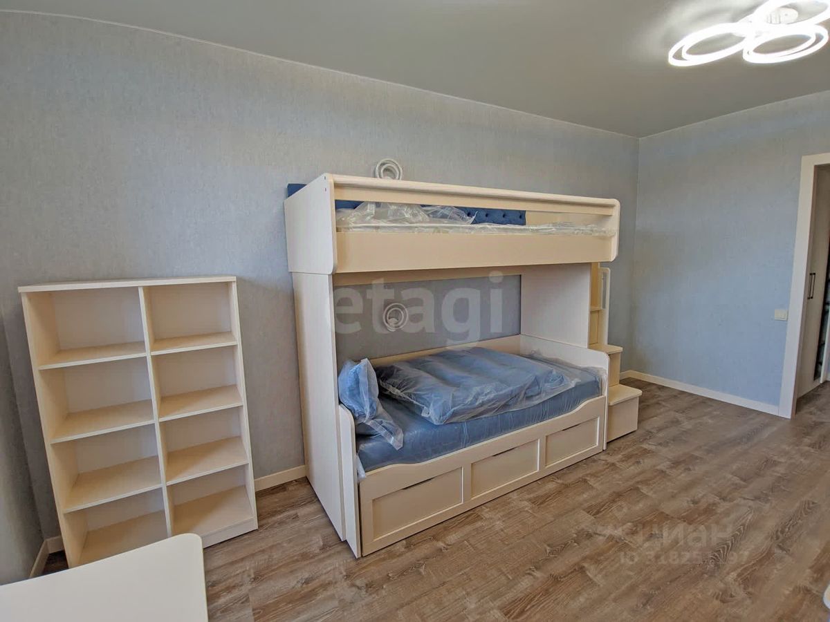 Планировка для большой семьи: • Просторная гостиная с ТВ • Спальня с гардеробной и разноцветной подсветкой по периметру • Детская с гардеробной: 4 кровати и зона под спортивный уголок • Панорамные окна с видами на природу и дальние корпуса ЖК • Просторный балкон с отделкой из липы с обзором детской площадки