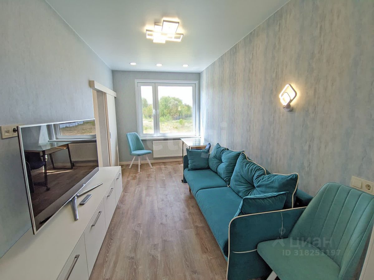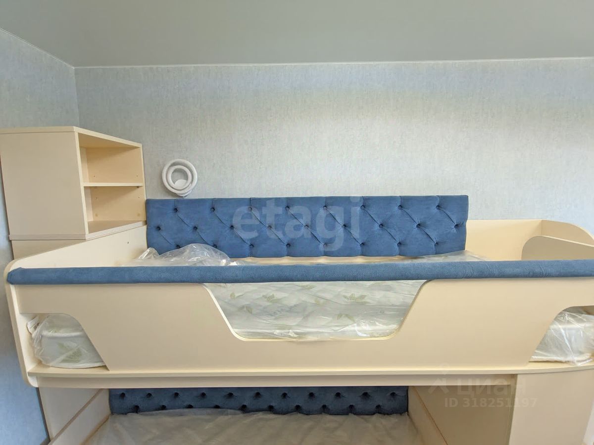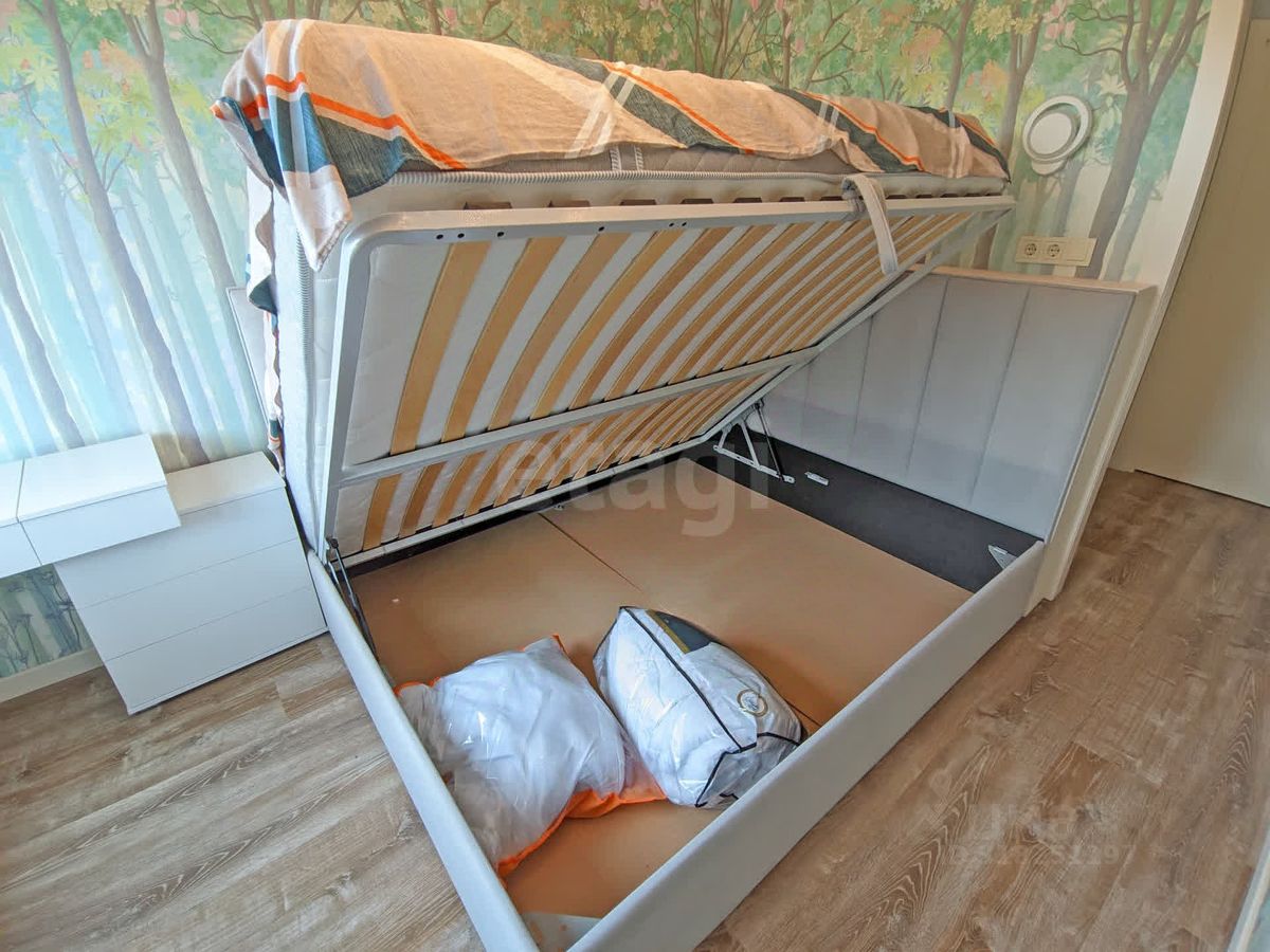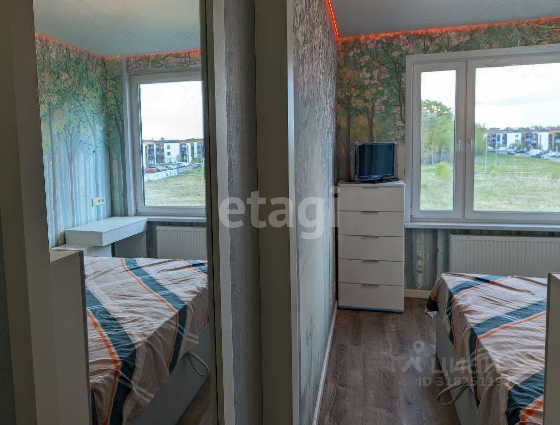 Планировка для большой семьи: • Просторная гостиная с ТВ • Спальня с гардеробной и разноцветной подсветкой по периметру • Детская с гардеробной: 4 кровати и зона под спортивный уголок • Панорамные окна с видами на природу и дальние корпуса ЖК • Просторный балкон с отделкой из липы с обзором детской площадки