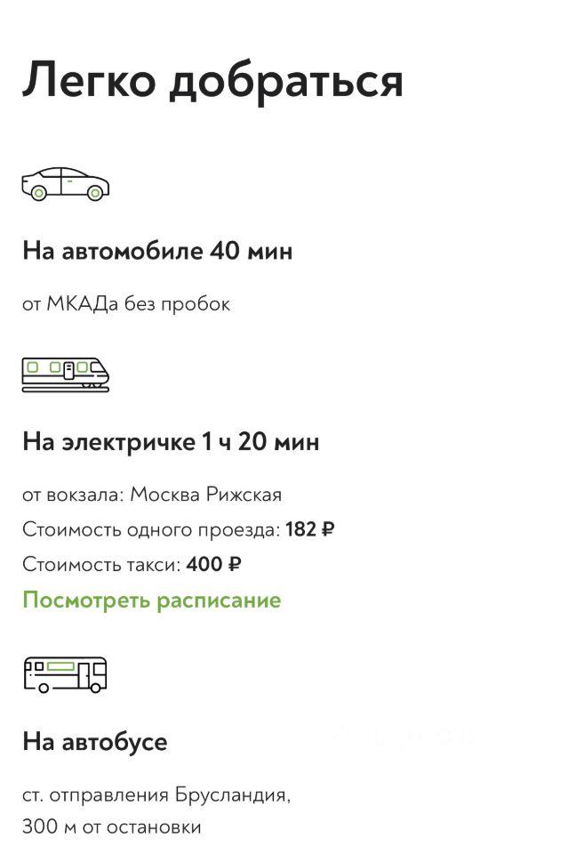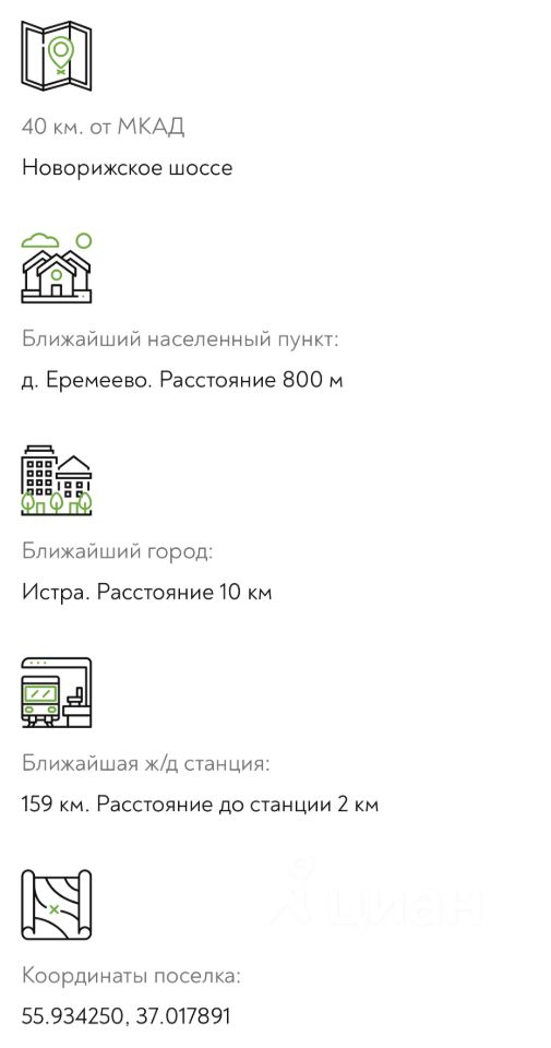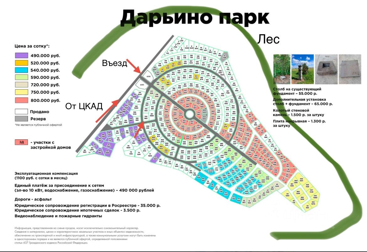 Почему Дарьино Парк это особое место: Современная инфраструктура: Асфальтированные дороги (въезд + внутрипоселковые), тротуары с плиткой, подземные коммуникации (никаких столбов!), только эстетичное уличное освещение. В перспективе газ. Комфорт и активность: Детские игровые комплексы, спортивные площадки, продуманный ландшафтный дизайн поселка красивой круговой формы. Участки доступны как с подрядом, так и без. Природа и экология: Поселок практически по периметру окружен лесом! Наслаждайтесь чистым воздухом, тишиной, прогулками, сбором грибов и ягод прямо у дома. Отличная транспортная доступность: Всего 50 км от МКАД по скоростному Новорижскому шоссе. В легкой досягаемости на автомобиле деревня с магазинами, платформа электрички, город Истра, Агрогородок.