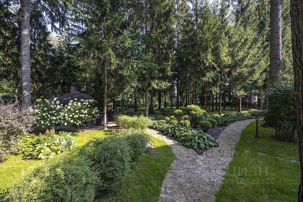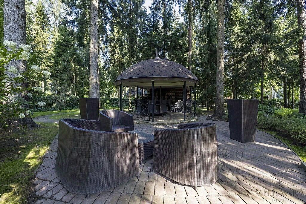 Двухэтажный особняк с бассейном, расположенный на лесном участке в 50 соток с ландшафтным дизайном и прогулочными дорожками в тени корабельных сосен.