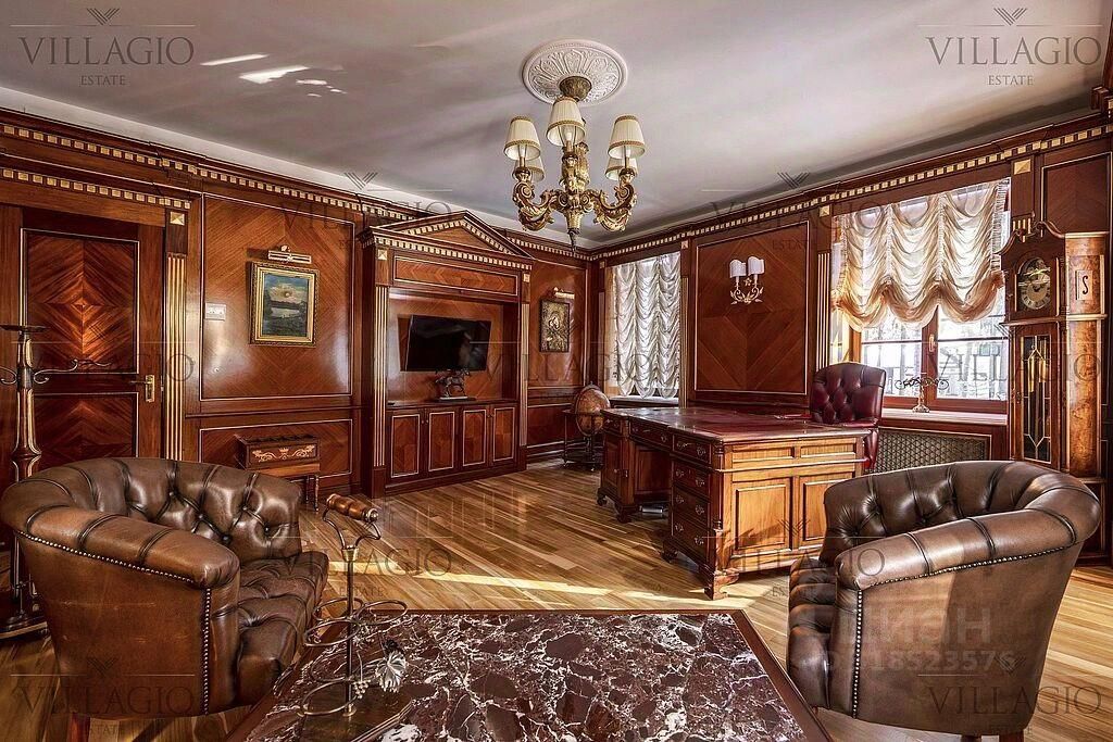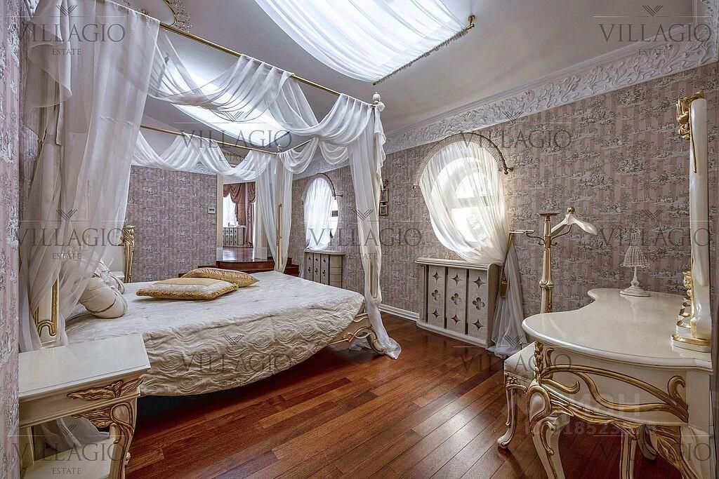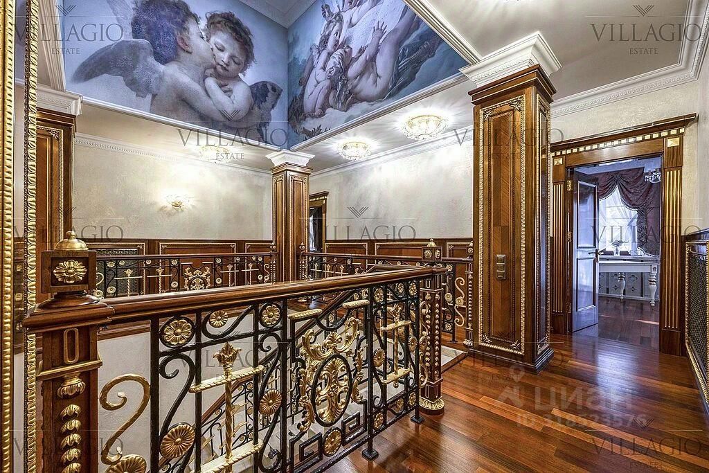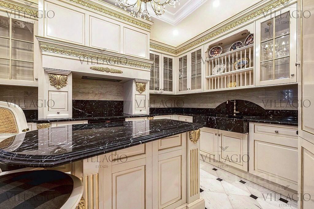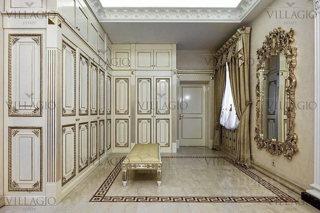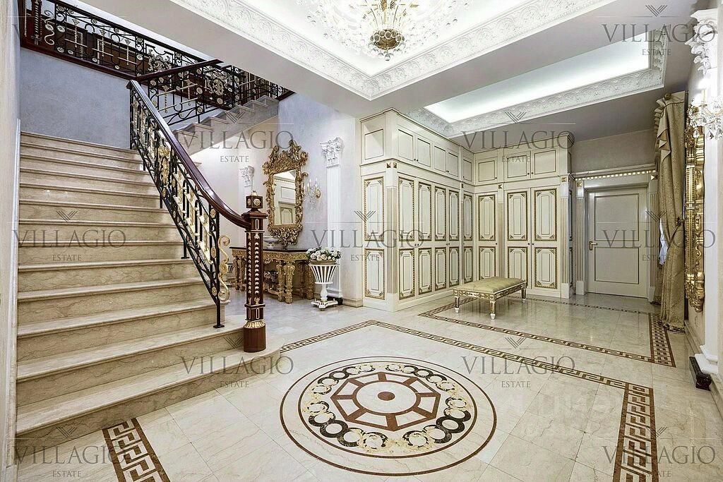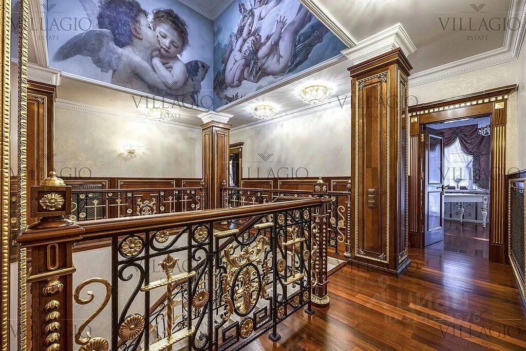 Интерьеры выполнены в дворцовом стиле. В особняке расположены 5 спален, 4 из которых с ванными, spa-зона с бассейном и сауной, гостиная с камином, кабинет и бильярдная комната. В отдельное здание со входом в дом вынесены гараж на 2 авто и квартира для персонала.