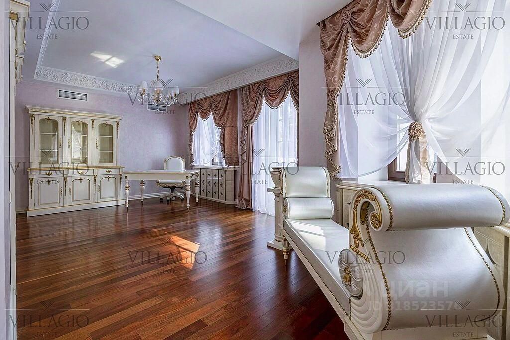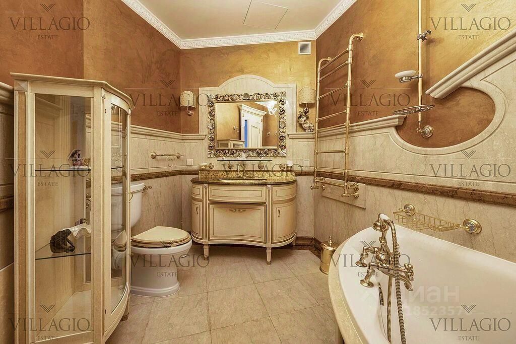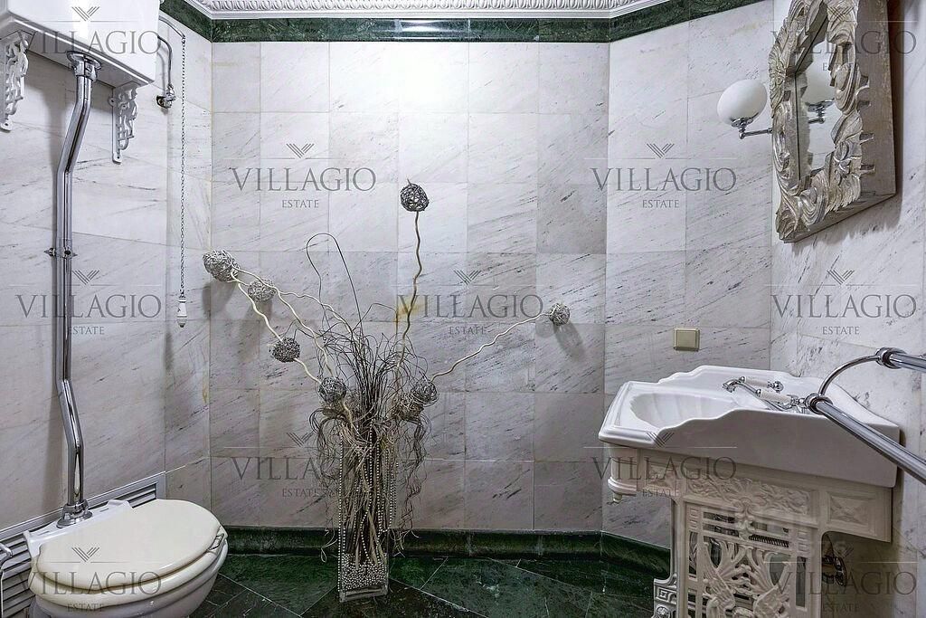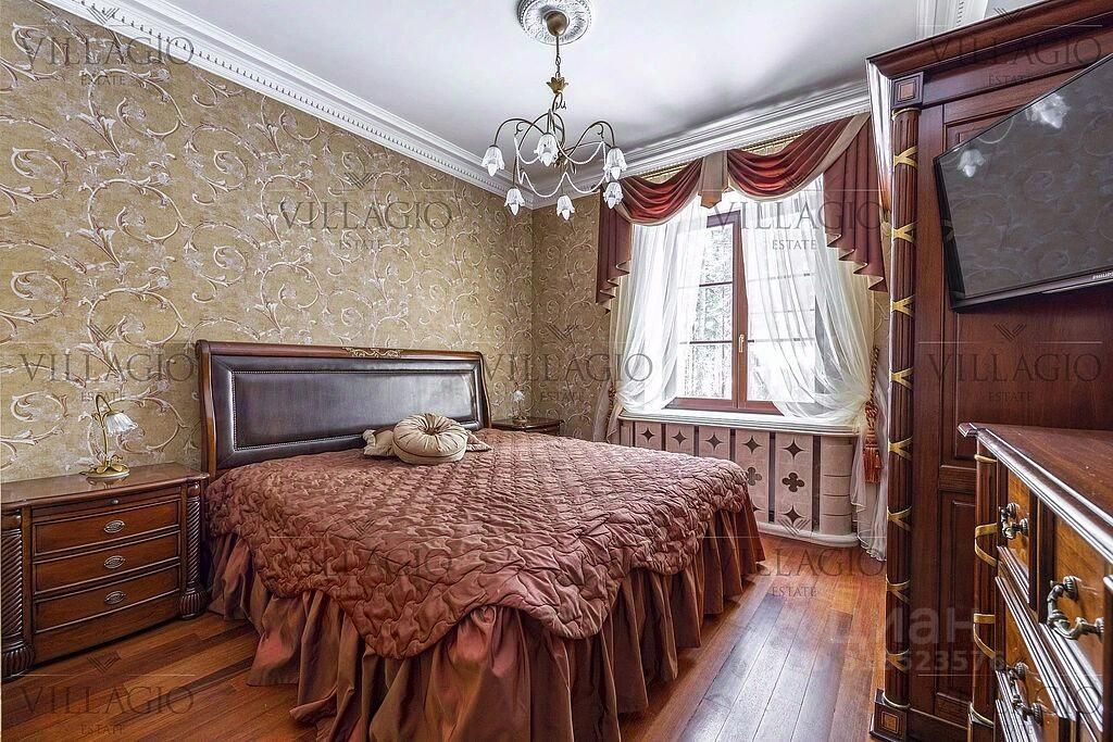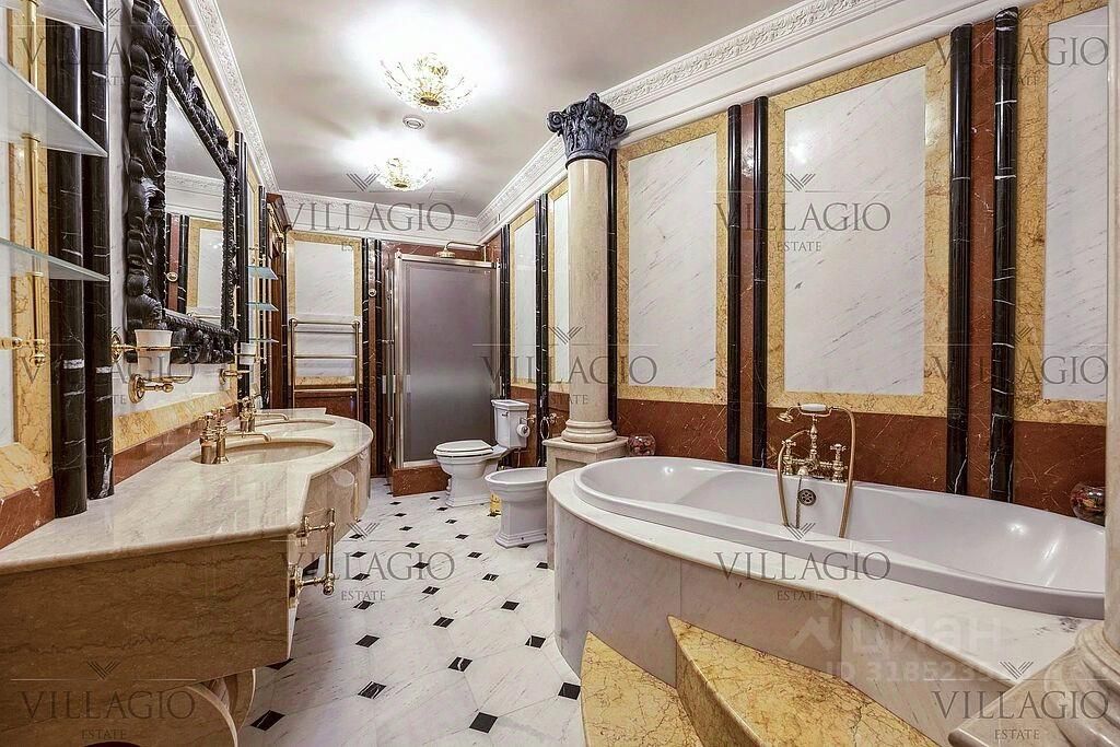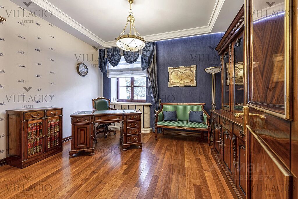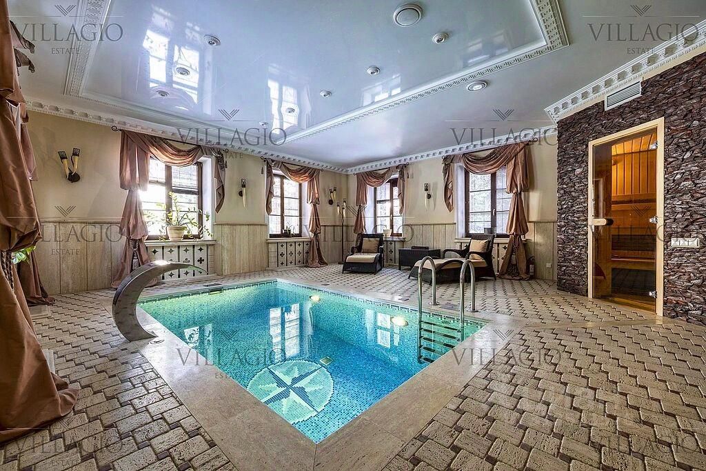 Интерьеры выполнены в дворцовом стиле. В особняке расположены 5 спален, 4 из которых с ванными, spa-зона с бассейном и сауной, гостиная с камином, кабинет и бильярдная комната. В отдельное здание со входом в дом вынесены гараж на 2 авто и квартира для персонала.
