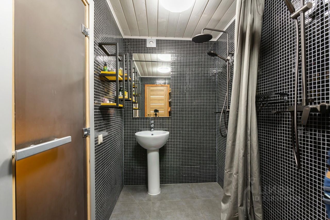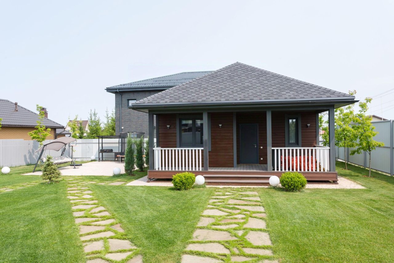 Гостевой дом-баня, 1 этаж, площадь 71 кв. м, 2023 года постройки. Планировка: кухня-гостиная, спальная комната, баня, душевая, санузел, котельная.