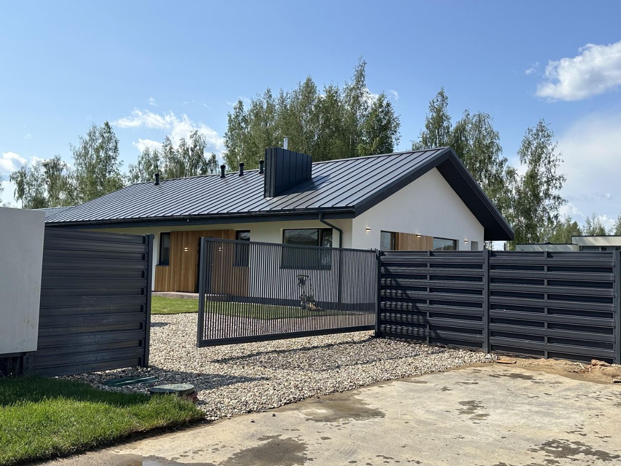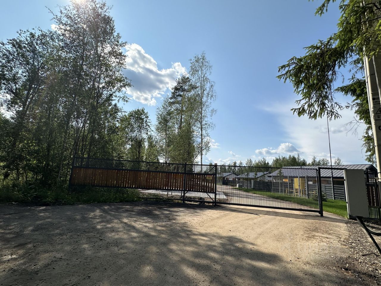 Участок огорожен, высажен газон, откатные ворота. Коммуникации: центральный водопровод, магистральный газ в поселке, электричество 15 кВт, канализация септик.