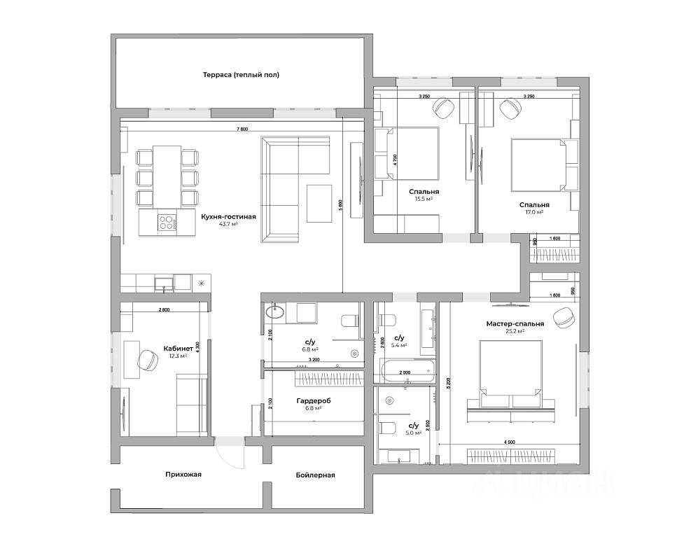 Просторная прихожая с гардеробной комнатой и санузлом, кухня-гостиная 43 кв.м., мастер спальня (для родителей) со своим санузлом и гардеробной, две детские с отдельным санузлом, кабинет-гостевая комната, просторная крытая терраса с видом на парк. Котельная с отдельным входом, в ней расположили - газовый котел (Baxi, мощностью 24 кВт), водоподготовка, постирочная.