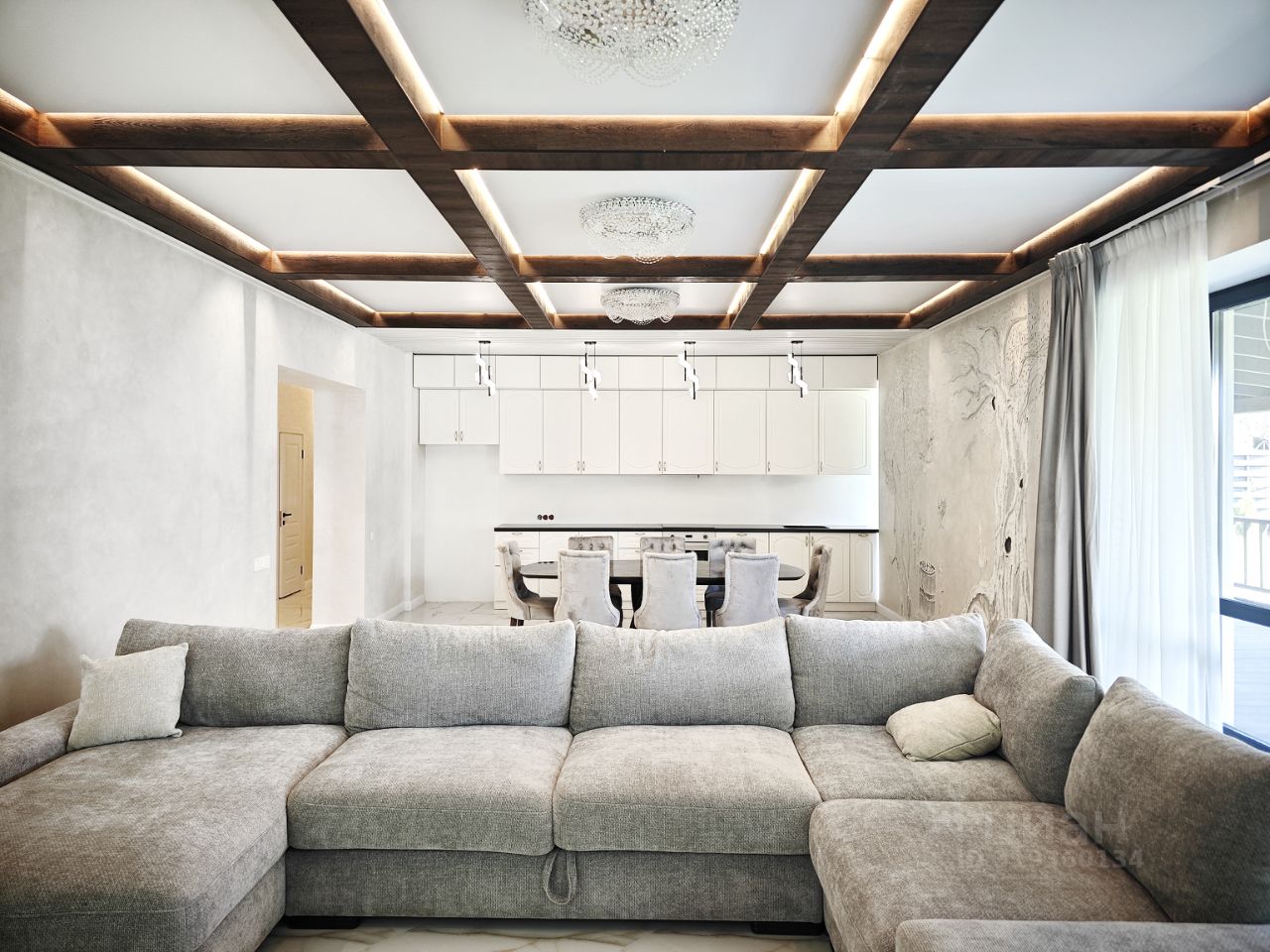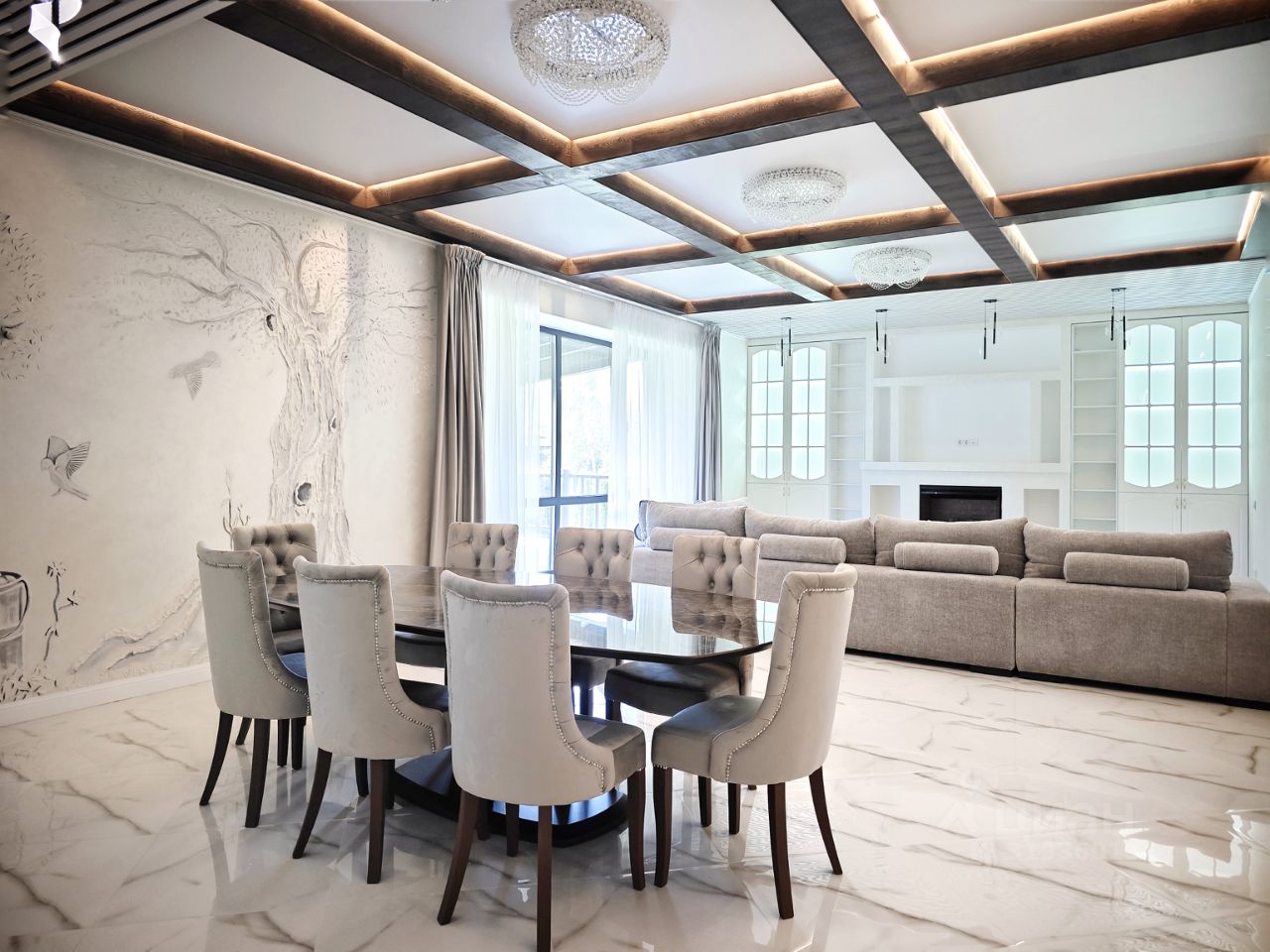 1 этаж: - Просторная гостиная (65 м²) с камином и панорамными окнами, отдельный выход на террасу и участок. - 3 спальни, 2 санузла, постирочная комната и котельная. - Прихожая 43 м² с теплыми полами.