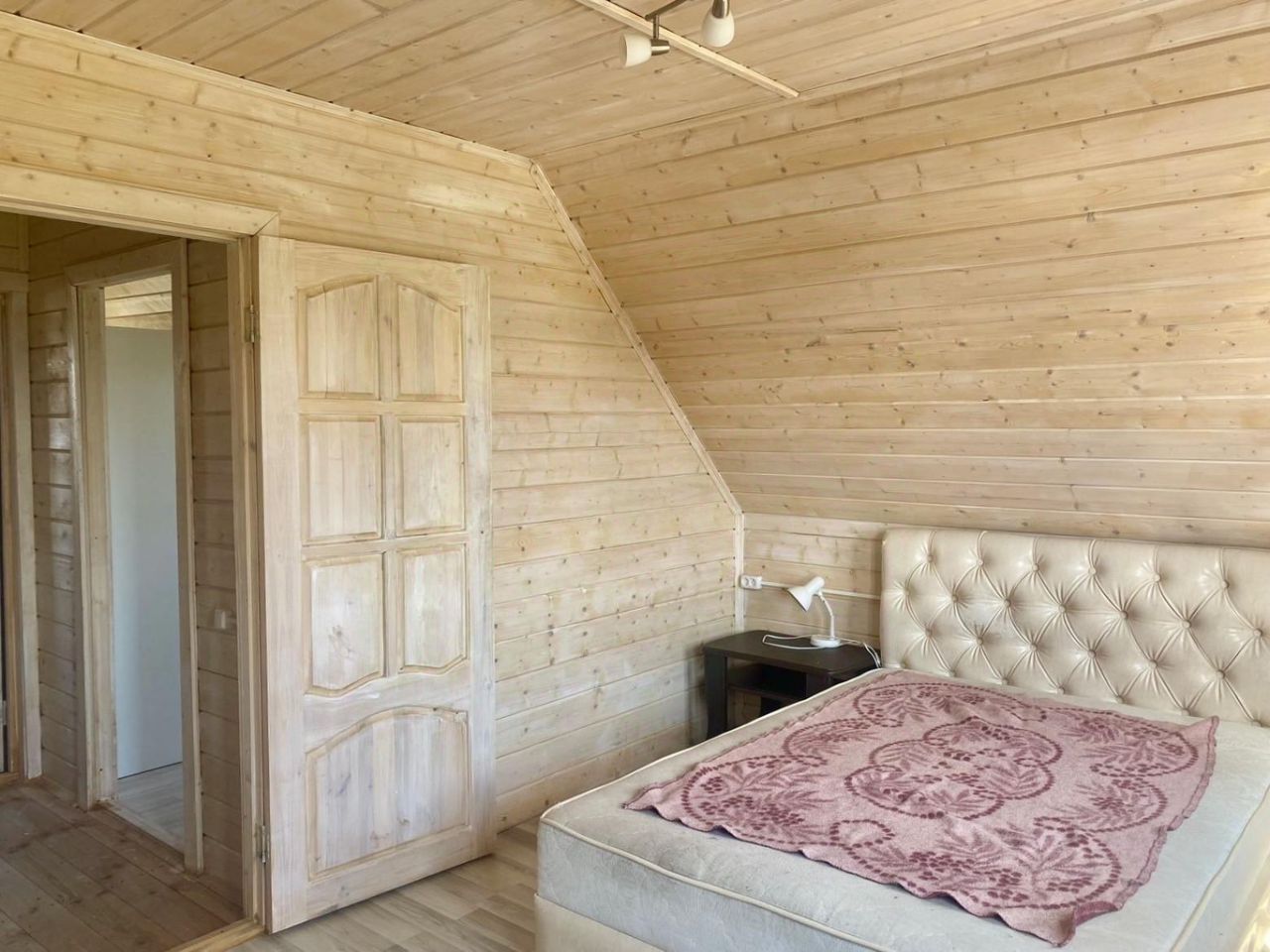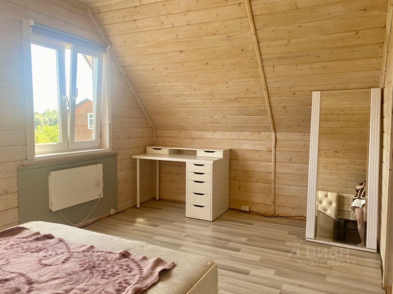 На первом этаже расположены кухня-гостиная, спальня, санузел и гардеробная с окном. Второй этаж - две комнаты и кладовка.