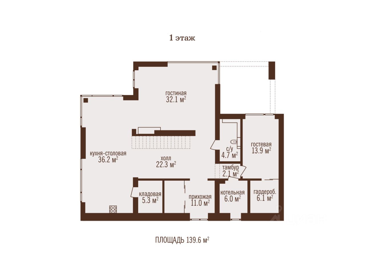 1-й этаж: прихожая, гардеробная, кухня-столовая, кладовая, просторная гостиная, гостевая комната с гардеробом, санузел, постирочная, бойлерная .