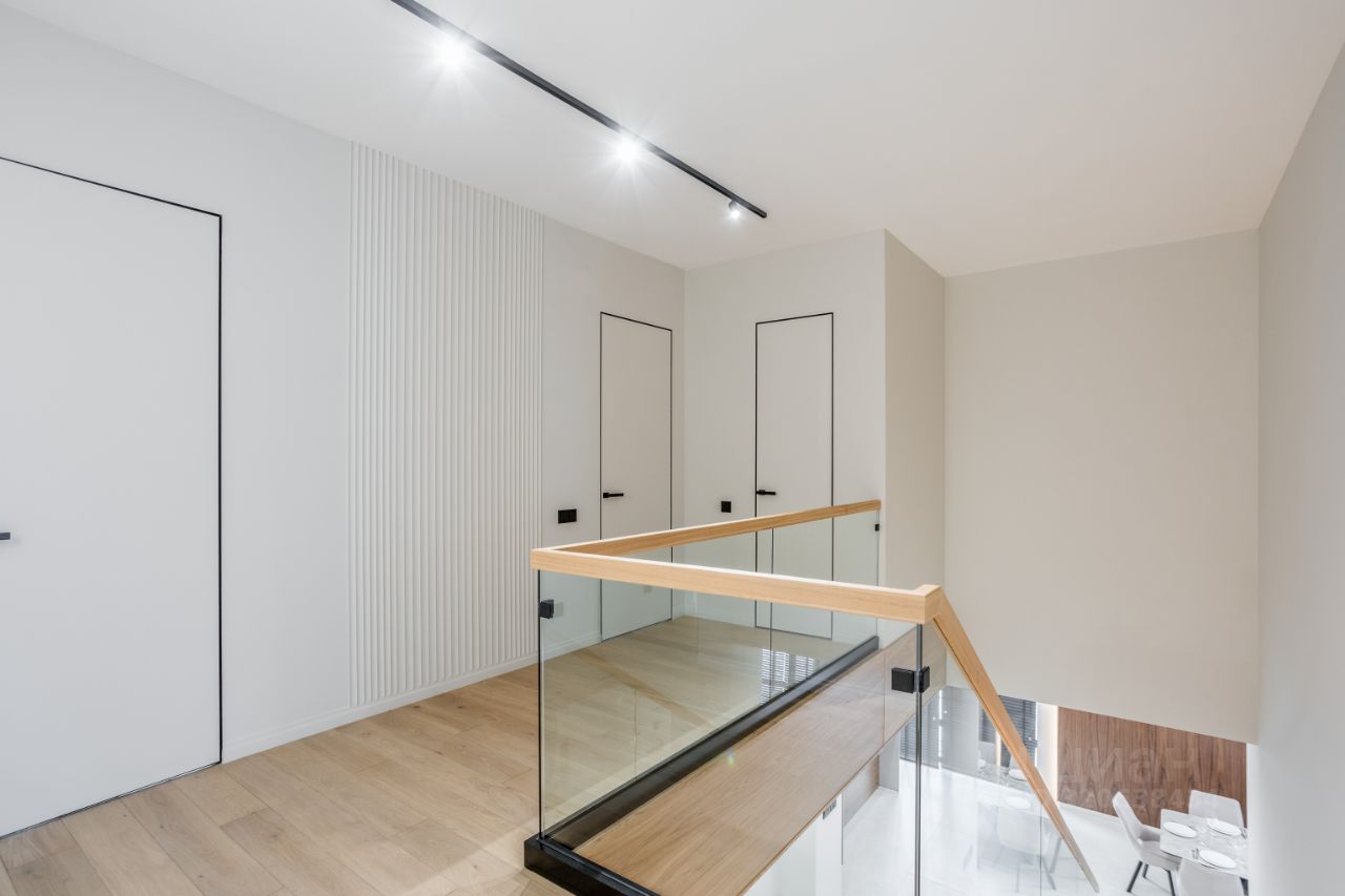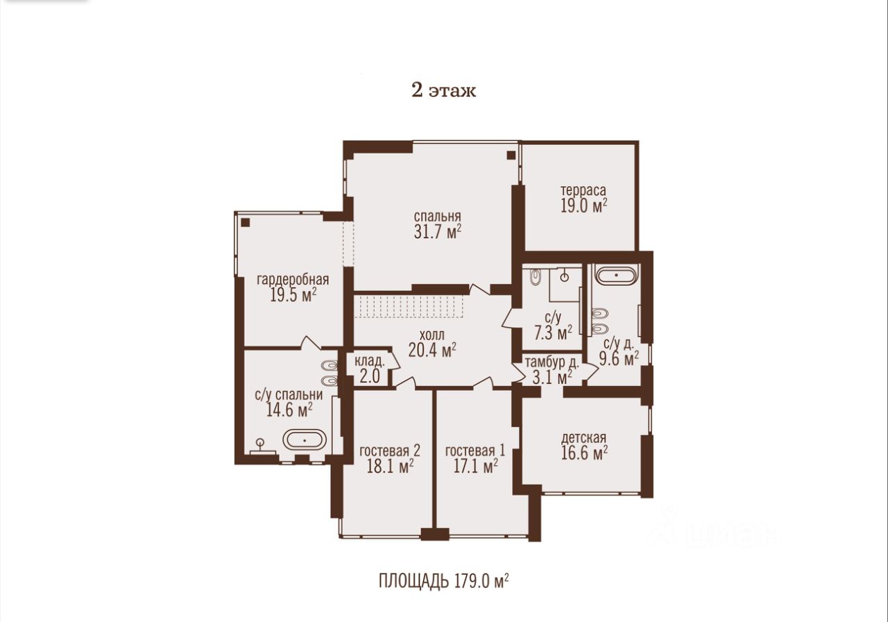 2-й этаж: мастер-спальня с гардеробной, санузлом и выходом на балкон, три спальни, одна из них с санузлом, санузел, кладовая.