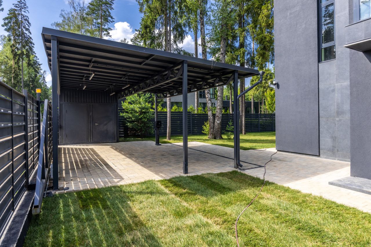 При въезде на участок оборудован навес на два автомобиля, оборудовано тех. помещение для хранения, установлена зарядка под электромобиль.