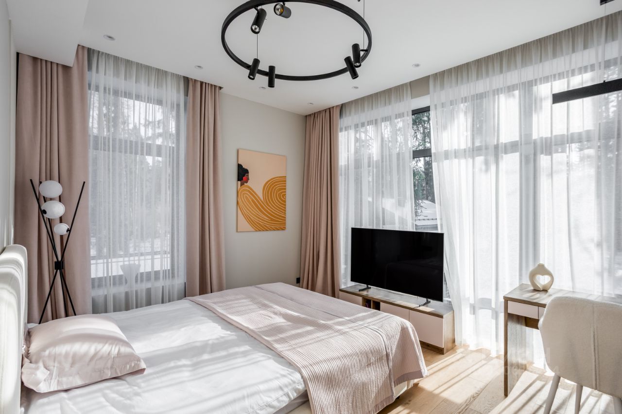 Дом, как и отдельно стоящая баня, предлагается с полной отделкой и мебелью. В интерьере использовались исключительно натуральные и экологичные материалы.