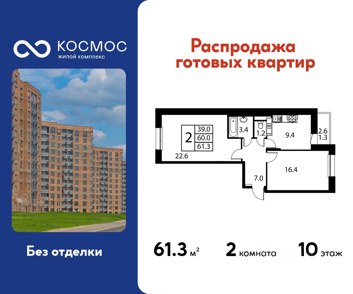 Продаётся 2-комнатная квартира в сданном доме (Корпус 7), срок сдачи: 2-кв. 2025, общей площадью 61.30 кв.м., на 10 этаже.