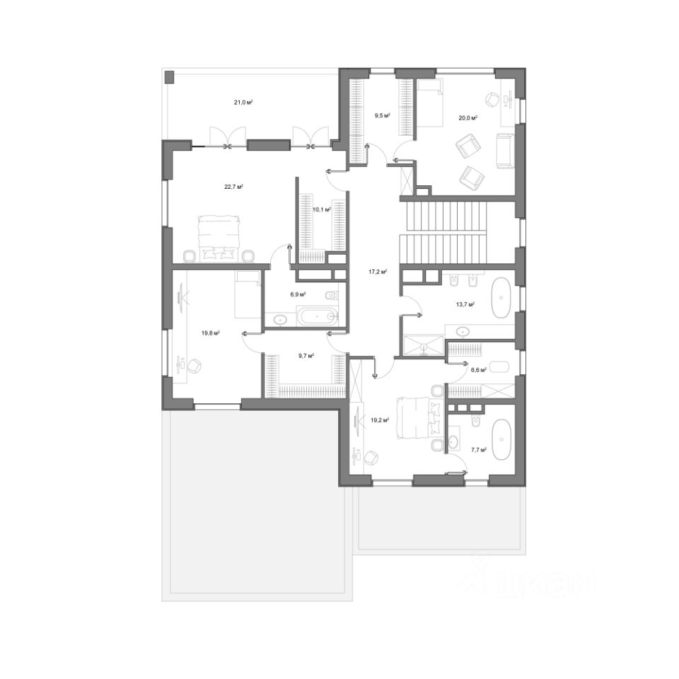 Второй этаж отведён под спальни с персональными гардеробными.