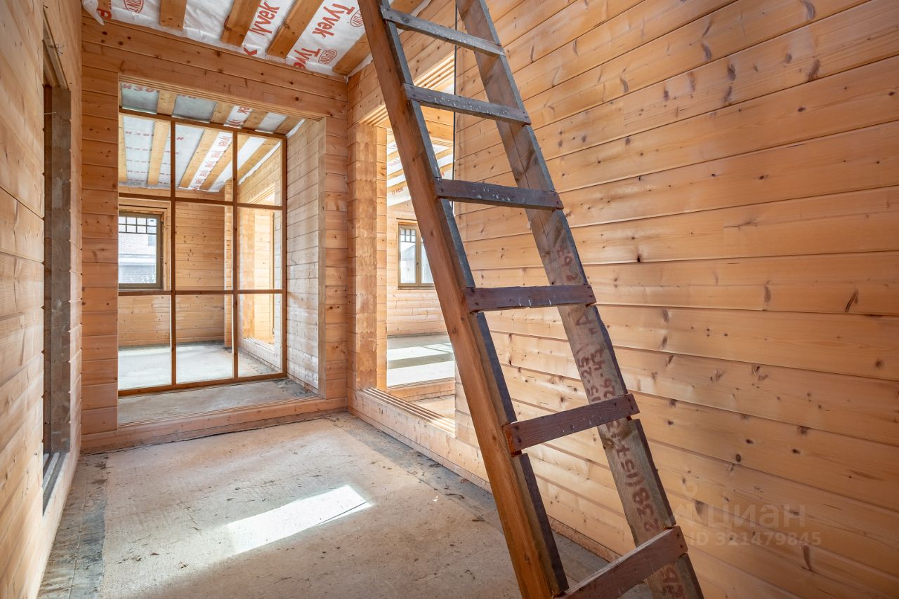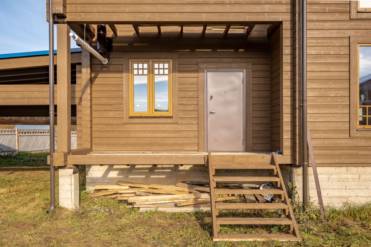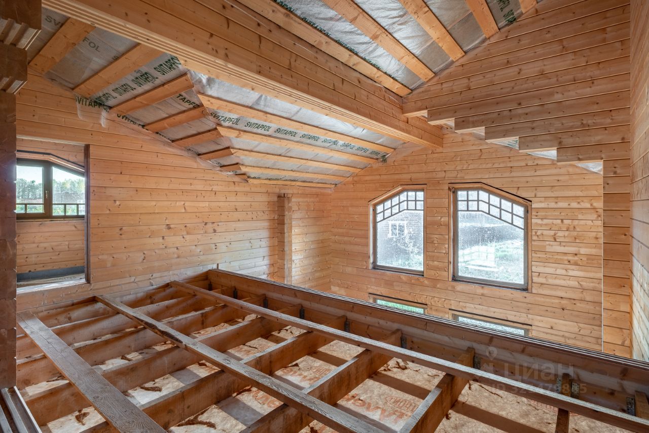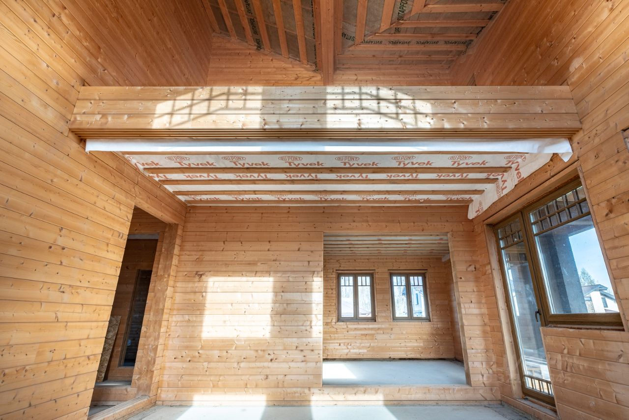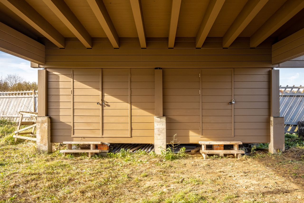 Площадь дома 195,6 кв.м. + терраса, балкон и подвал общий метраж 220 метров. Материал: клеёный брус (200мм), крыша мягкая черепица цвета Джинса. Высокий фундамент: буронабивные сваи, ленточная бетонная. Бетонный подвал в рост, залит фундамент под камин, утепленная крыша, а на участке проведена планировка (выравнивание с градиентом уклона).