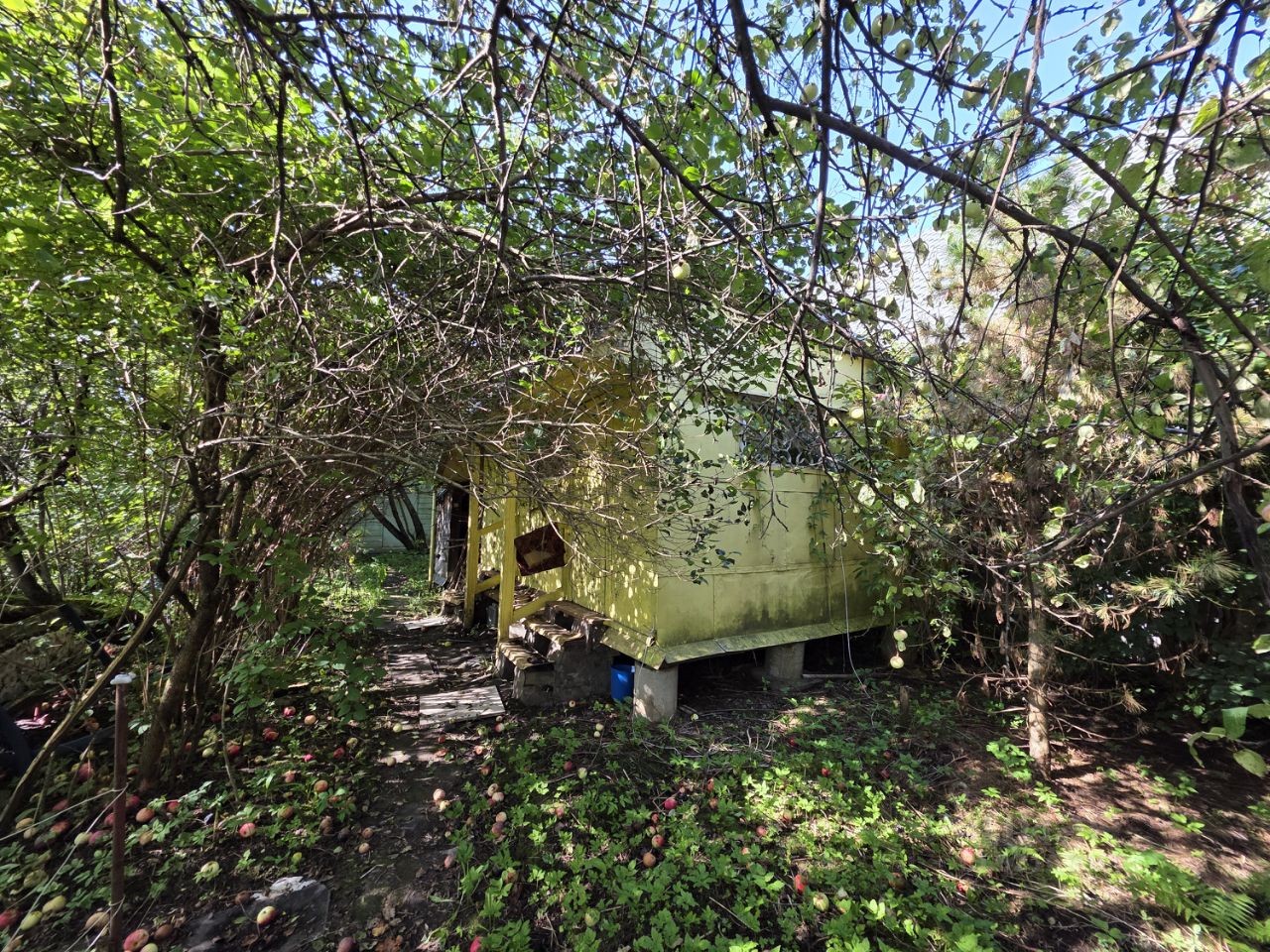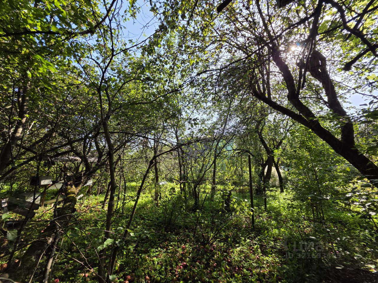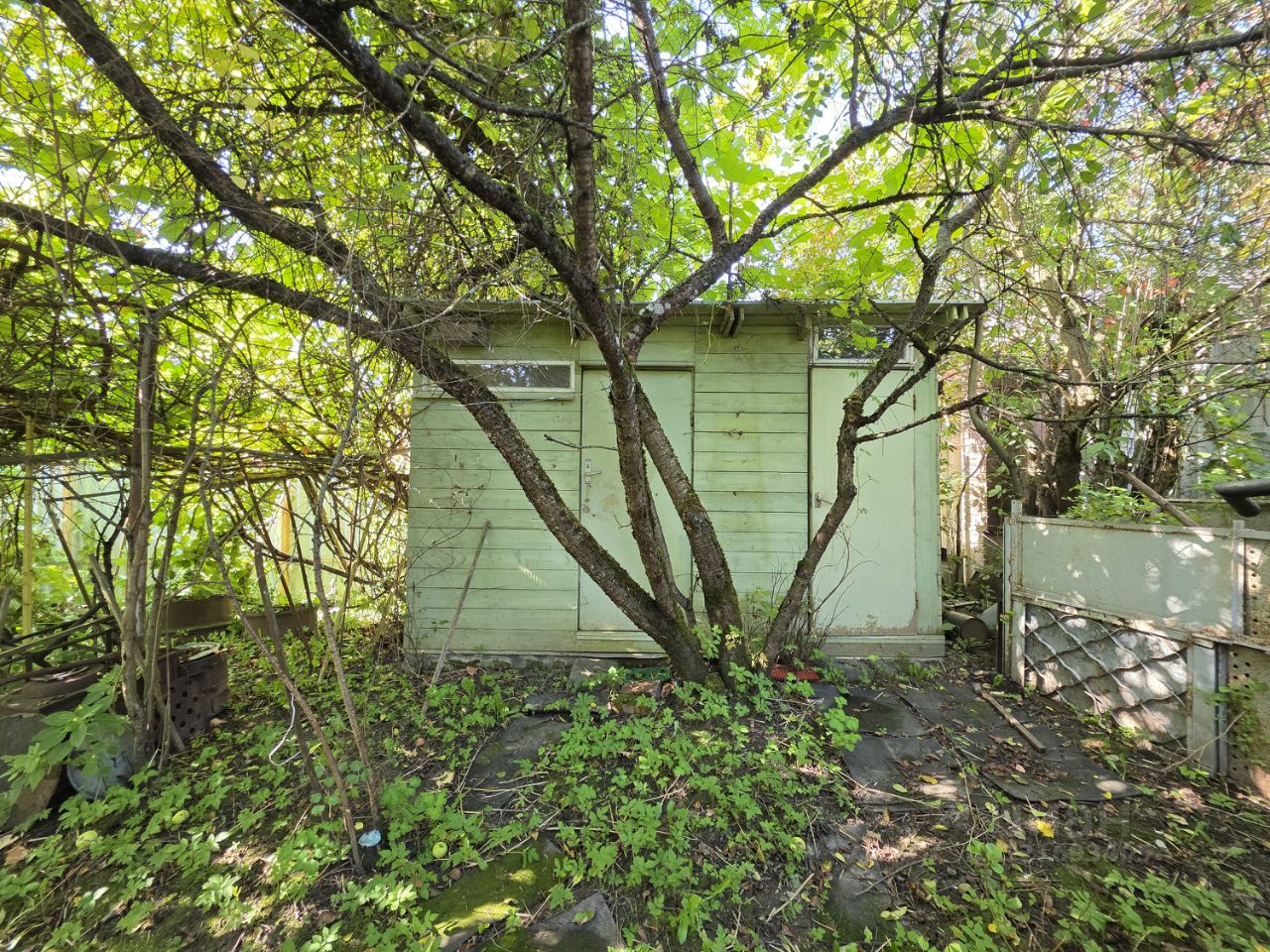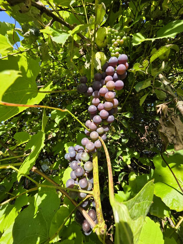 На участке расположен садовый дом 60 м2, гараж, хозяйственный постройки, растут яблони, виноград, ель.