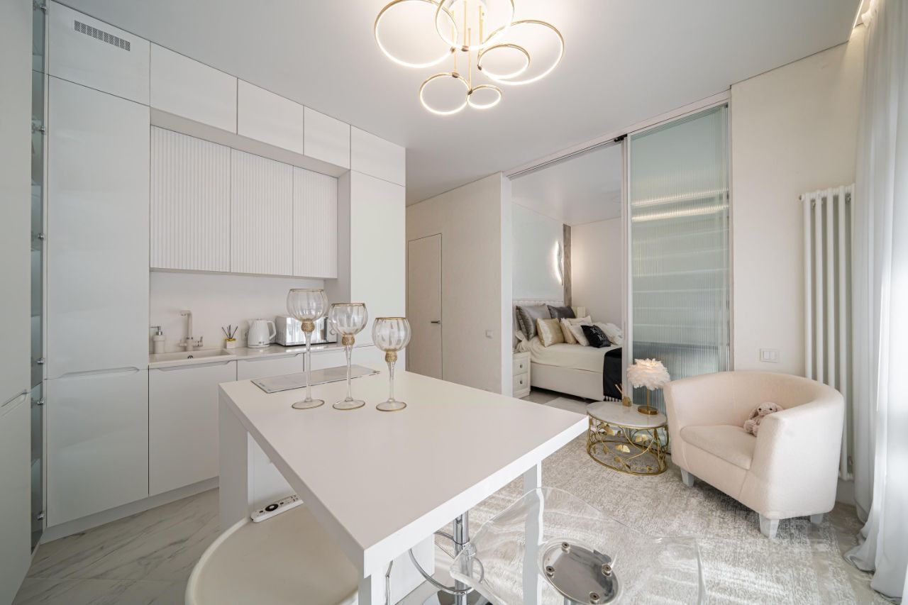 Функциональная планировка включает : - кухня-гостиная (кухня оборудована всей необходимой техникой), - спальня (установлен кондиционер), - большая гардеробная, - санузел с душем и ванной, - прихожая с встроенным шкафом для верхней одежды и выделенной постирочной зоной.