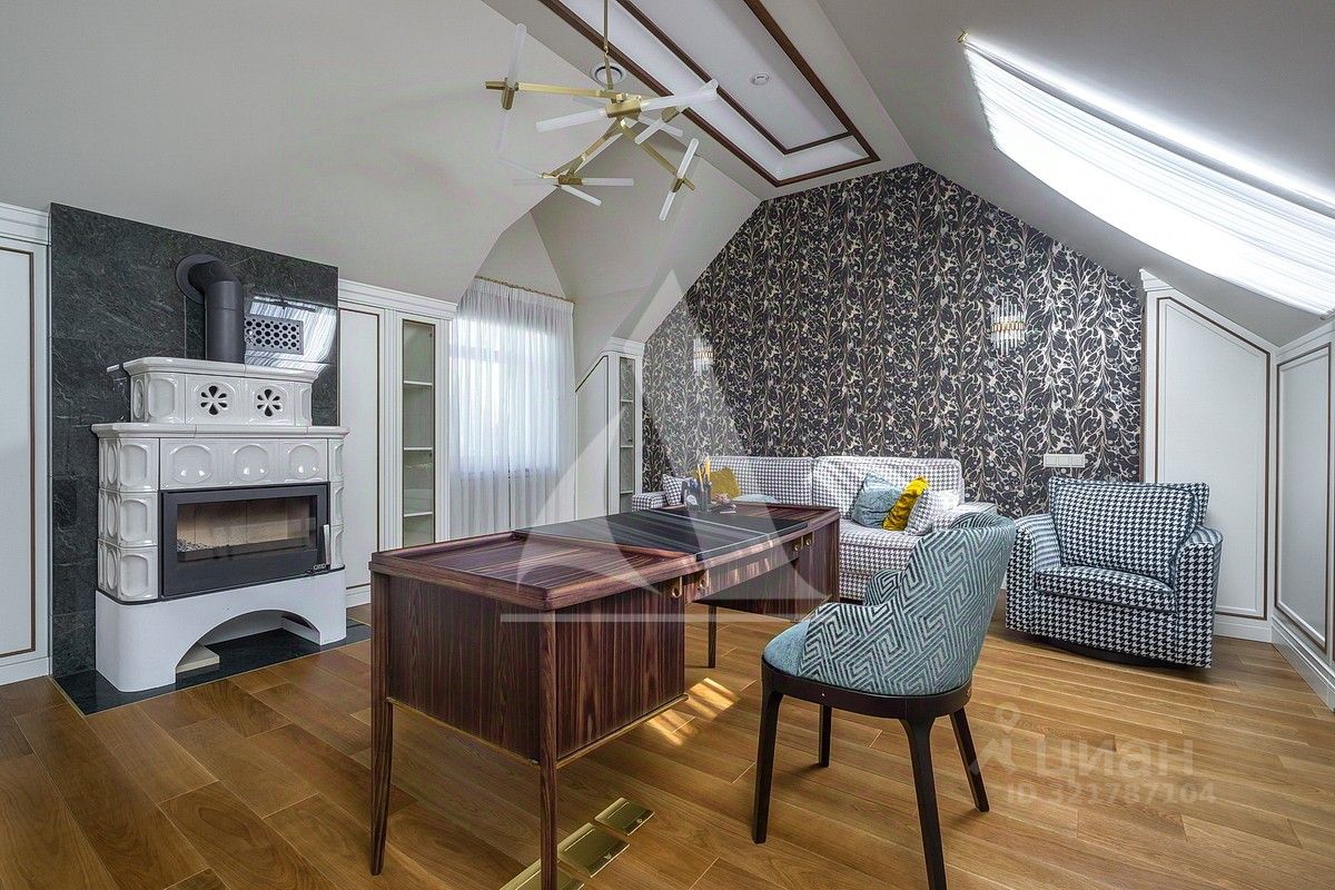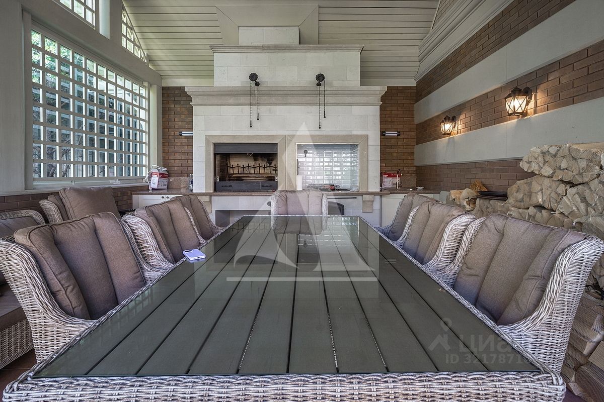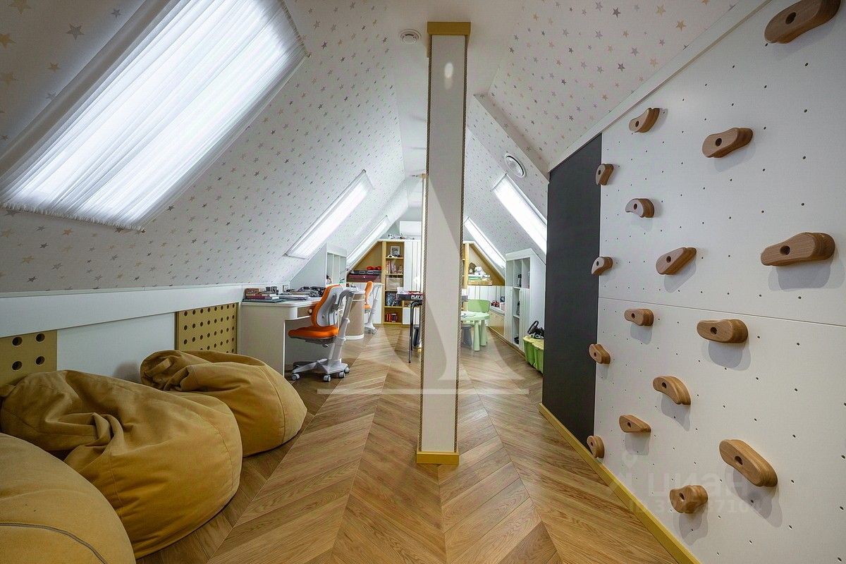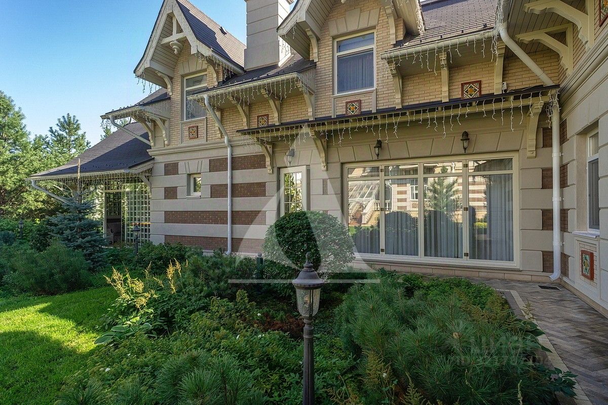 На участке расположен гараж на три автомобиля, с тренажерным залом, сауной и хамамом, с зоной отдыха, кабинетом и квартирой для персонала. Участок благоустроен, выполнены ландшафтные работы. 1 этаж: холл, кухня-столовая-гостиная, гостевой с/у, терраса. 2 этаж: мастер-спальня с двумя гардеробными и собственной ванной комнатой, две спальни, два с/у, две гардеробные. Балкон. Мансарда: музыкальный салон, игровая, гардеробная. Гараж: отдельностоящий