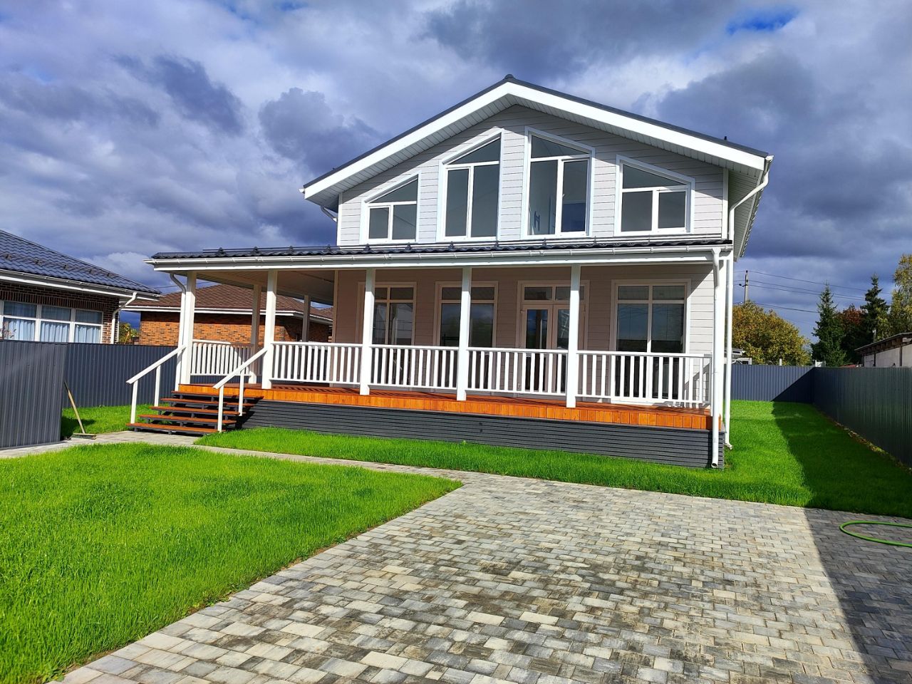 Каркасный дом построен по индивидуальному проекту. Внутренняя площадь - 144м2 + терраса - 41м2. Первый этаж кухня-гостиная с выходом на террасу, гостевая спальня, санузел, кладовка под лестницей, котельная, второй этаж - 3 спальни, санузел, гардеробная. Утепление стен 200мм (150мм в стойках +50мм перекрёстное), цокольное перекрытие, перекрытия первого и второго этажей - 200мм. Фасад облицован фибросайдингом DECOVER Первый этаж радиаторы + водяной теплый пол, второй этаж радиаторы. Газовый котёл от газгольдера. Фотофиксация всего процесса строительства с первого дня.