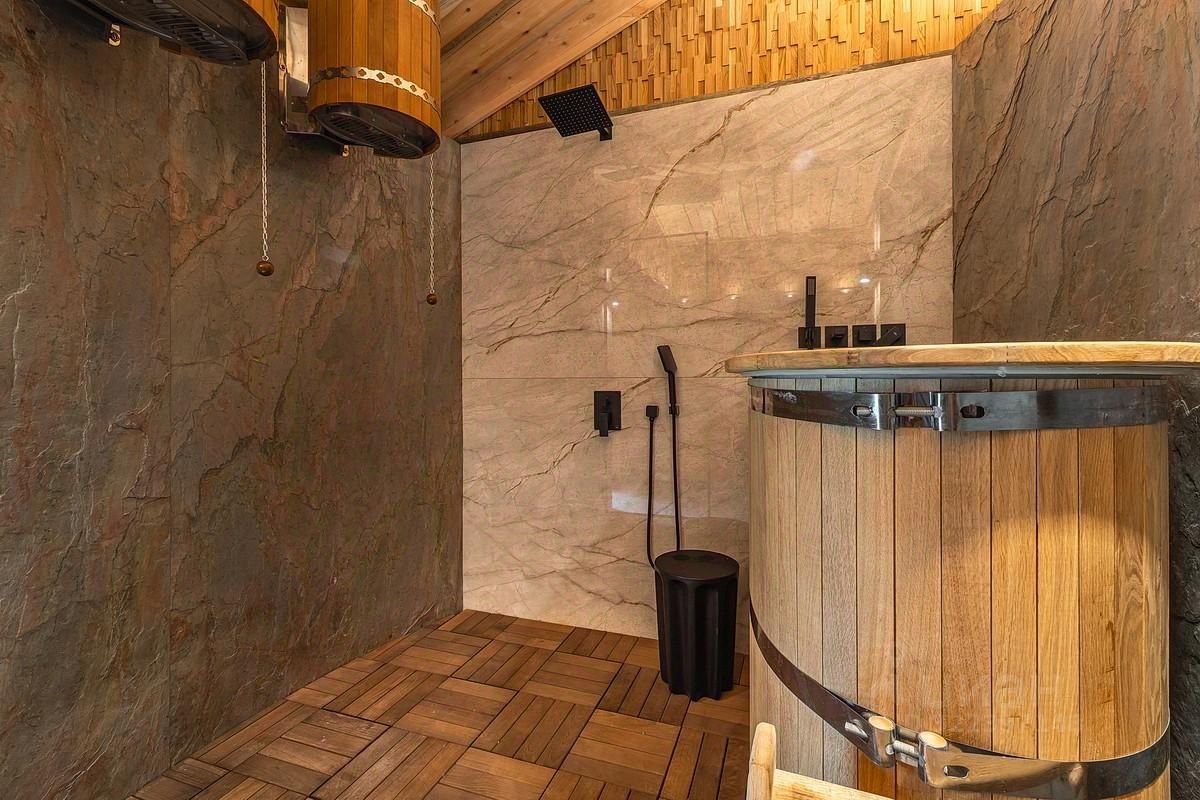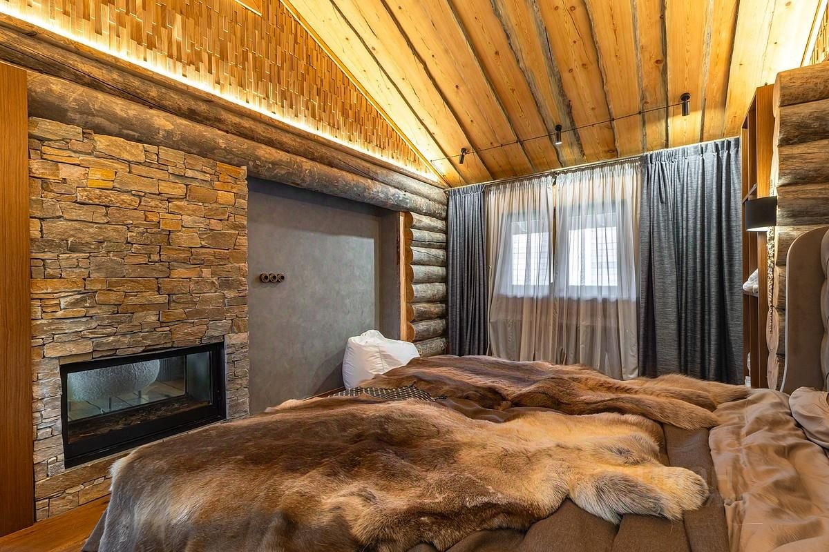 Планировка SPA-комплекса: холл, гостиная с дровяным камином и с выходом на участок, кухня-столовая, спальня с камином, баня с купелью, санузел, кладовая.
