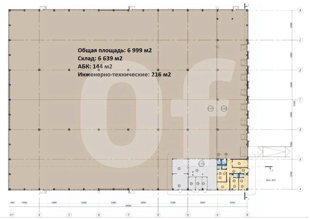 Общая площадь: 6 999 кв. м Склад: 6 855 кв. м АБК: 144 кв. м Инженерно-технические: 216 кв. м