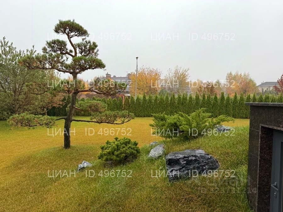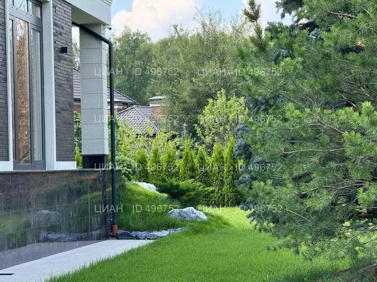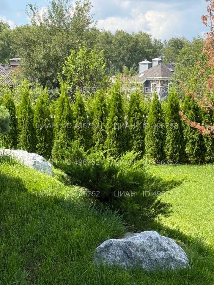На участке газон, бонсай, туи, деревья, голубые ели, можжевельник. Установлен автоматический полив. Забор по периметру участка. Ворота с электроприводом, откатные.