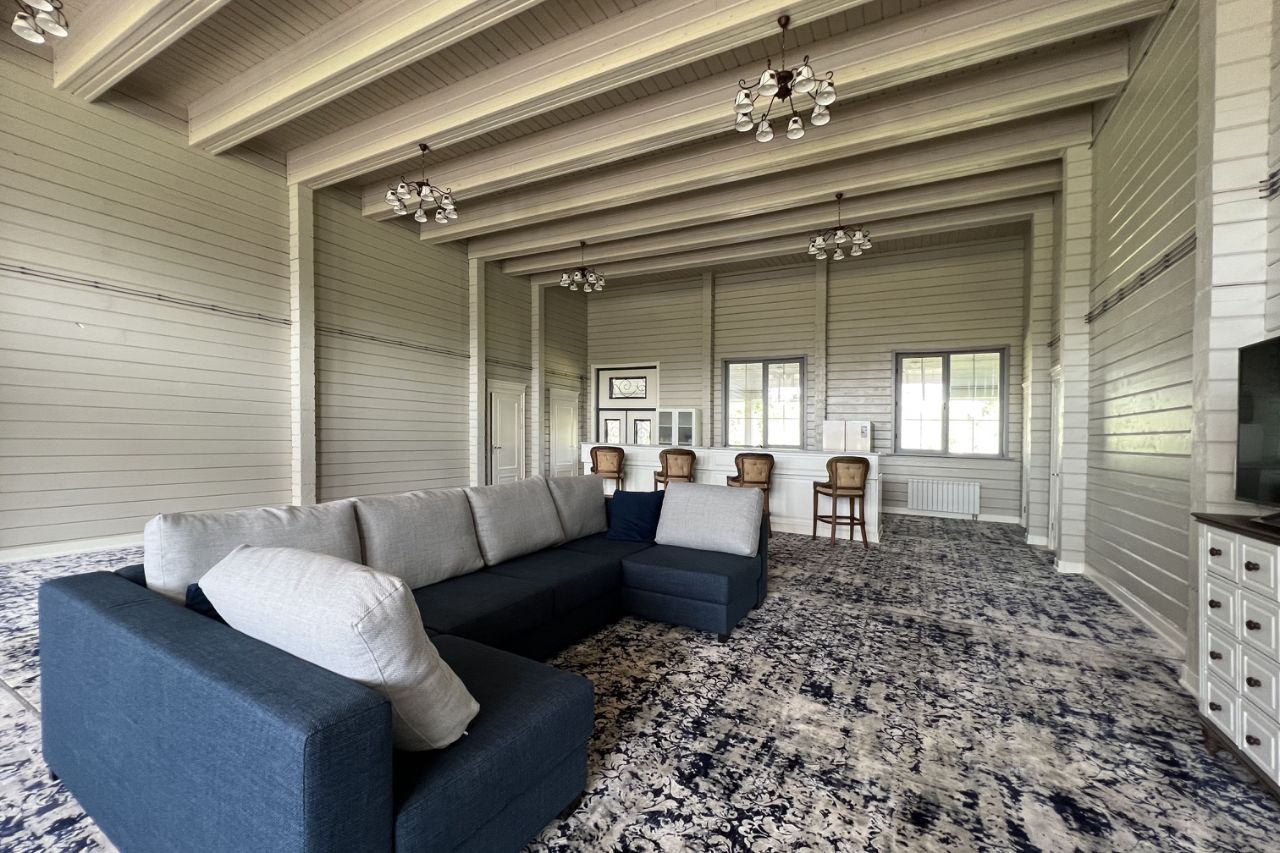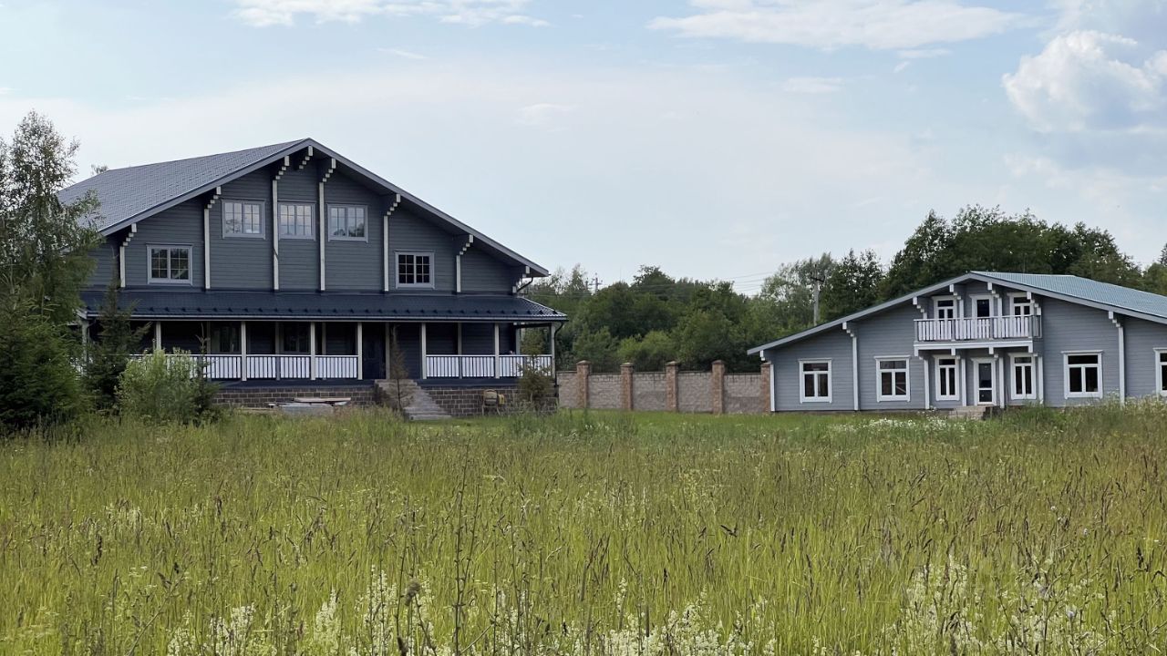 Земельный участок 43.5 сотки удобной формы с размерами 47 на 92 м. На участке двухэтажный гостевой дом 245 кв. м также из клееного бруса под финишные работы. В доме большая кухня гостиная, парная, помывочная, и на втором этаже комната отдыха. Перед домом большая площадка для стоянки автомобилей. На участке несколько садовых деревьев, газон. Соседний смежный участок есть только с одной стороны.