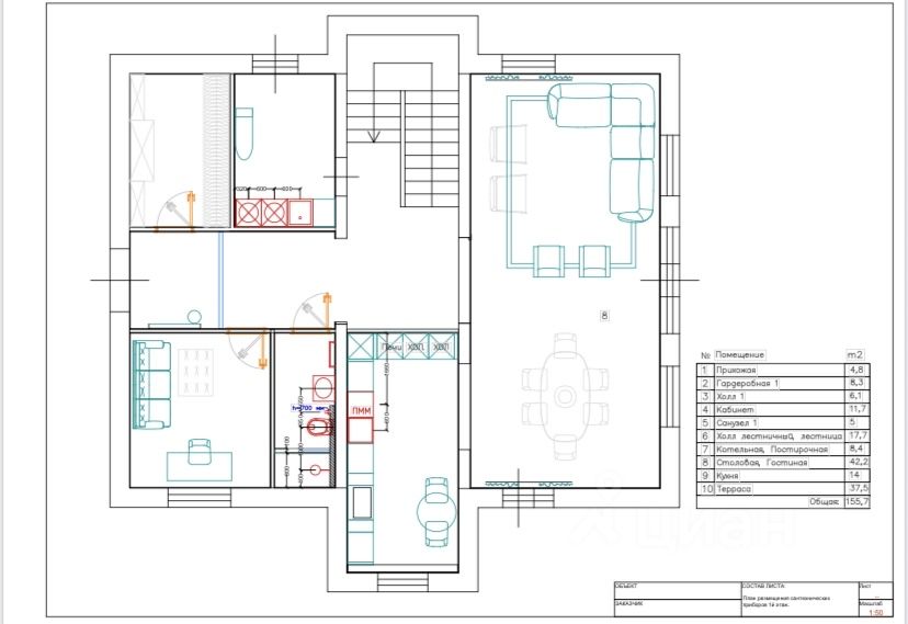 1эт.: прихожая, гардеробная, с/у, бойлерная, кухня-столовая гостиная с выходом на веранду, гостевая комната/кабинет