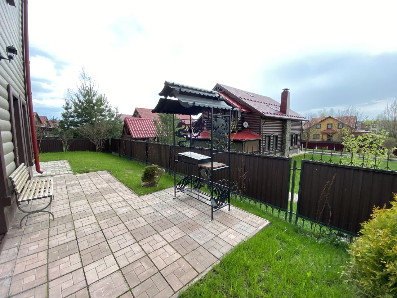 — 6 соток, ровный и благоустроенный, — газон, ели, плодовые деревья, — зона отдыха и барбекю, — огороженная территория.