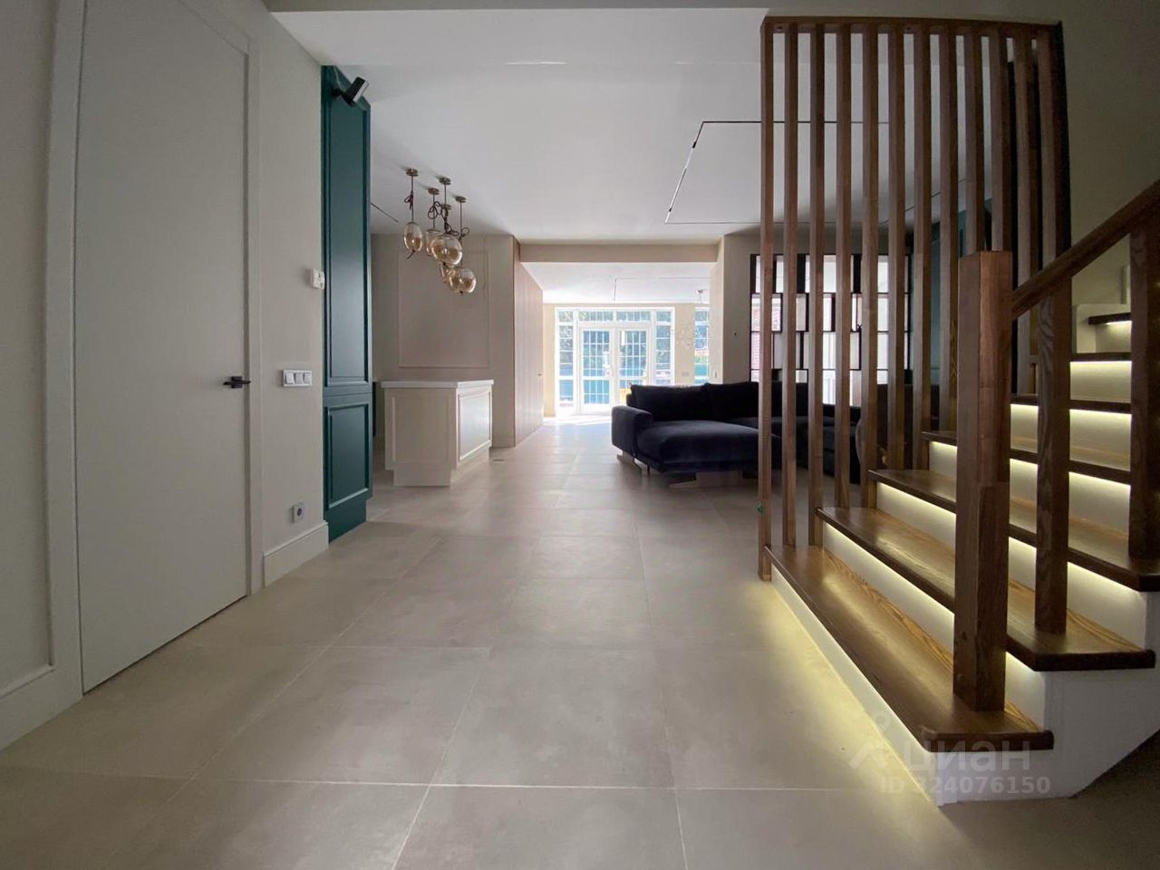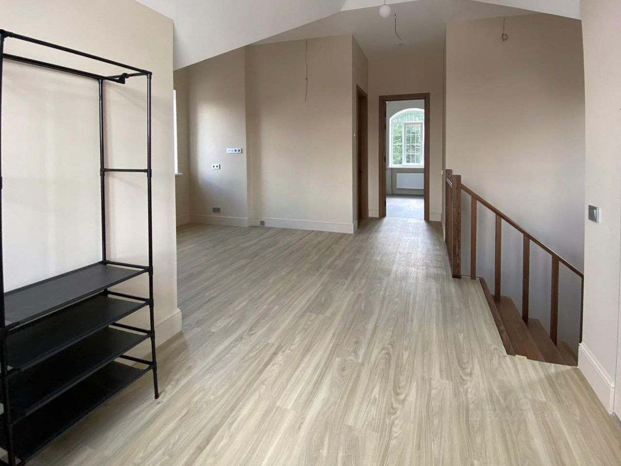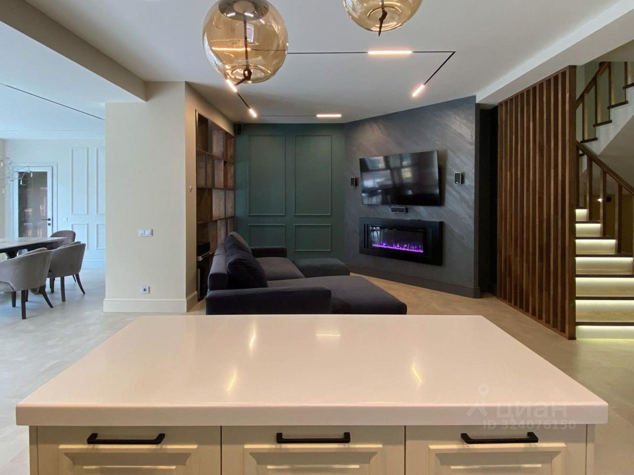 Особое внимание заслуживает лестница из натурального дуба с увеличенной площадкой под 90 градусов, декоративные панели так же выполнены из натурального дуба под заказ. Все двери в доме нестандартной высоты 2,4 м, что добавляет особую атмосферу пространства.