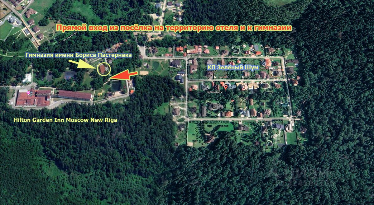 Коттеджный посёлок в лесном массиве. КП ''Зелёный Шум'' - красивое, уединённое место недалеко от Москвы. 57 км от МКАД по скоростному Новорижскому шоссе. Охраняемая территория посёлка огорожена по всему периметру и окружена смешанным лесом. В посёлке всего 57 домовладений, собственный пруд, прямо из посёлка есть вход на территорию отеля Hilton Garden Inn Moscow New Riga и к гимназии им. Бориса Пастернака. Жители посёлка могут посещать территорию отеля и пользоваться его инфраструктурой (прогулочные зоны, пруд с пляжем, ресторан, бар, кафе, прокат велосипедов, квадроциклов и снегоходов, спортивные площадки, теннисный корт, тренажёрный зал, спа-комплекс, сауна, хамам, бассейн).