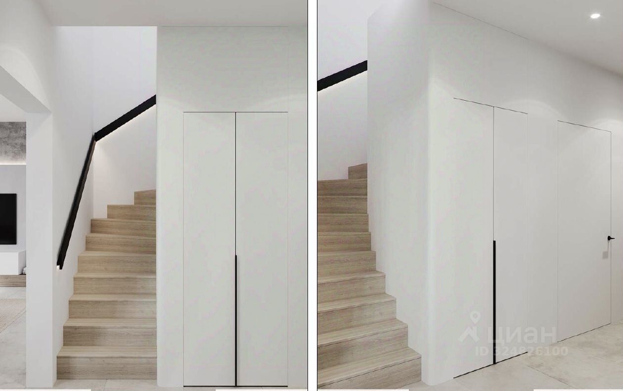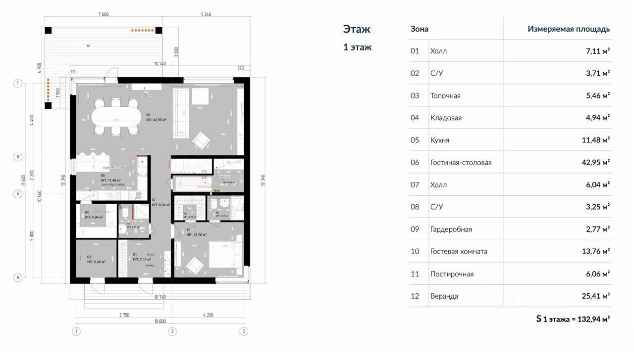 На первом этаже прихожая, гостевая спальня со своими санузлом и гардеробной комнатой, которую при желании можно оборудовать в качестве рабочего кабинета. Под лестницей размещена просторная постирочная. Кухня с кладовой, столовая с выходом на террасу и светлая гостиная. В помещении с отдельным входом расположена газовая котельная.